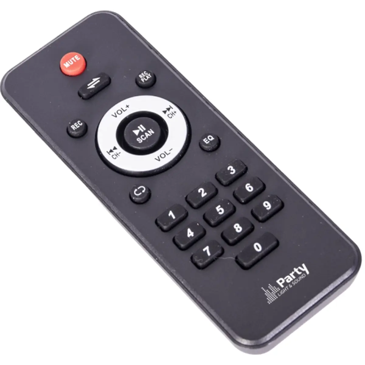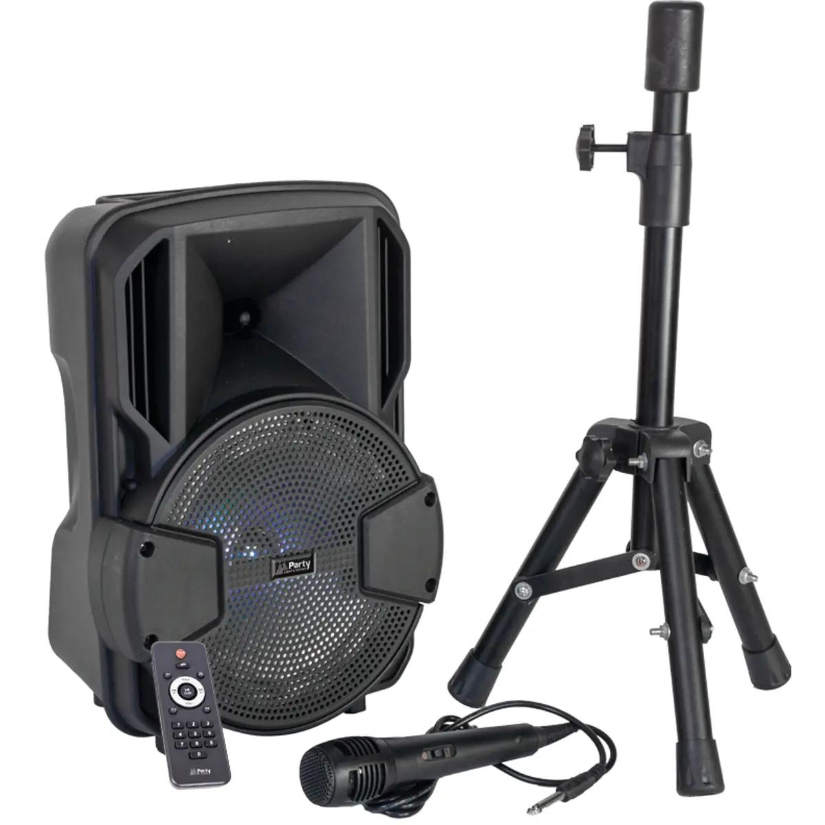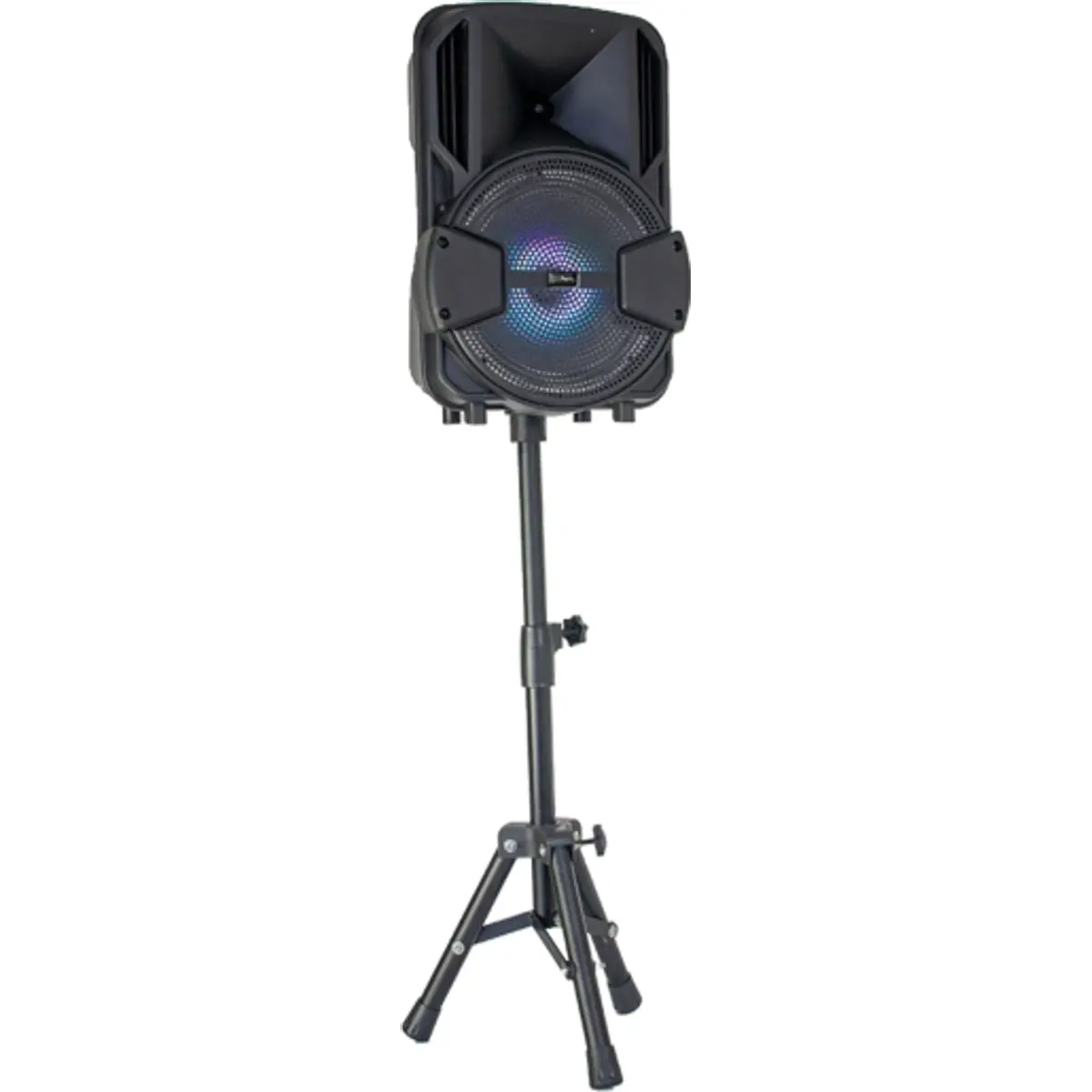 Inclui um suporte para a elevar (tripé extensível), um comando remoto e um microfone com fios, para falar ou cantar ao som da música.