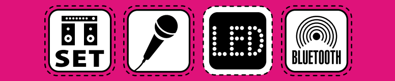 Possui um altifalante iluminado e uma barra de luz LED que projeta feixes de luz coloridos para o chão.
