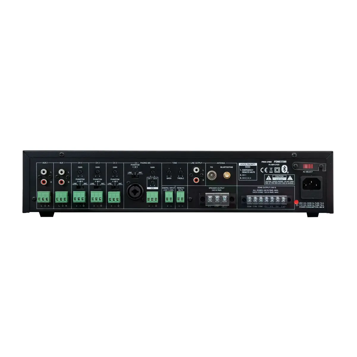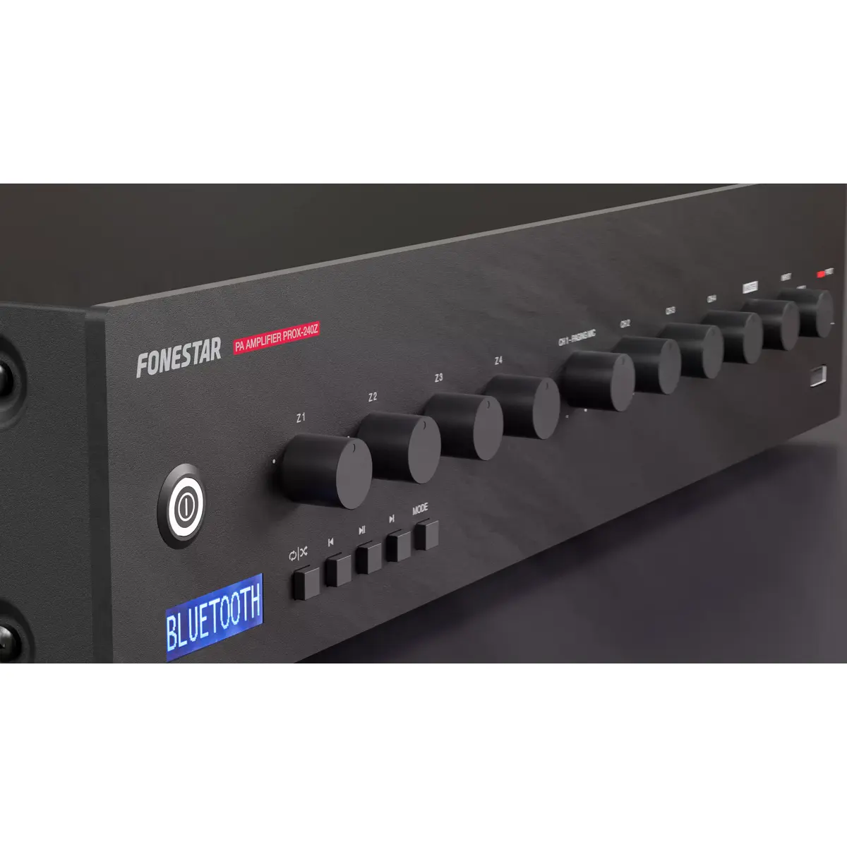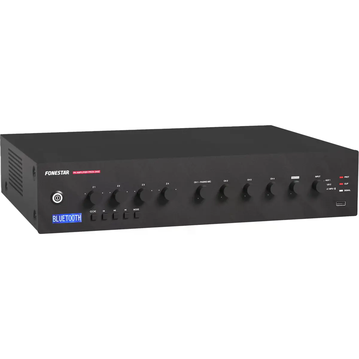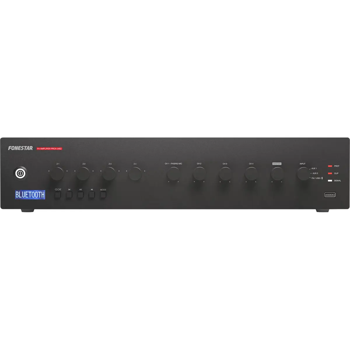 Amplificador de megafonia com reprodutor Bluetooth®/USB/FM e seletor de zonas de colunas.
