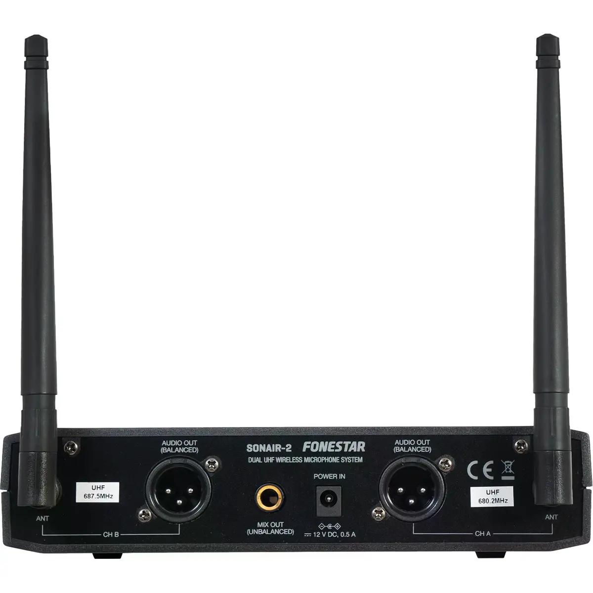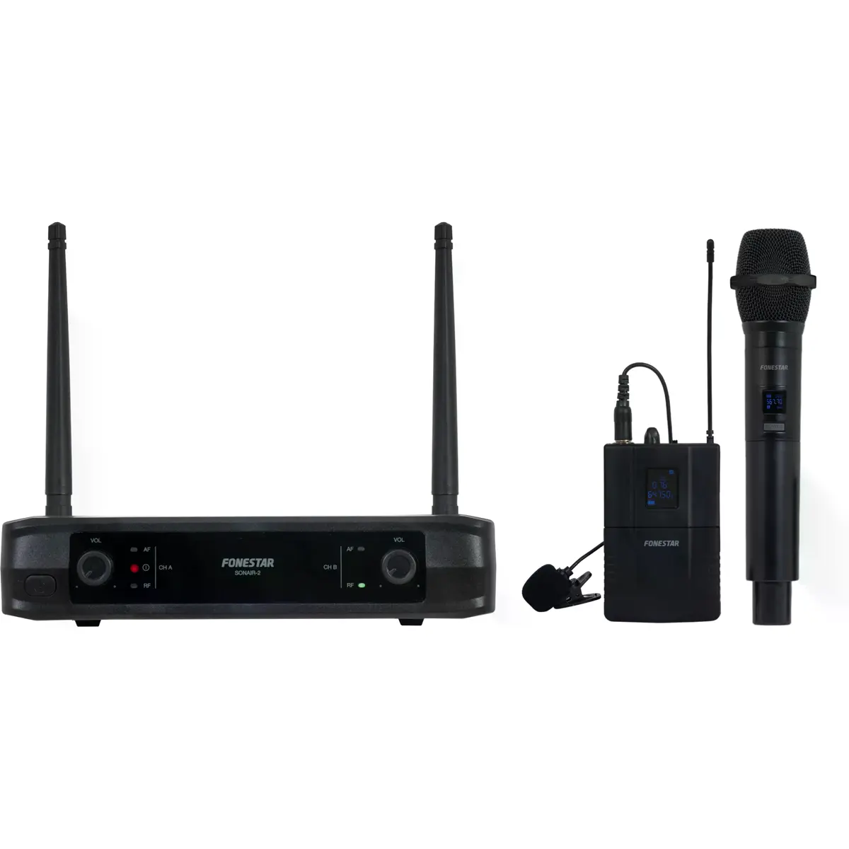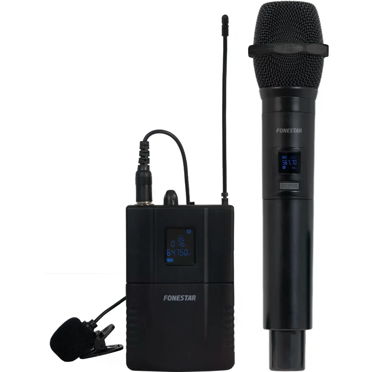 - Tipo: Microfone duplo sem fios de mão e portátil.