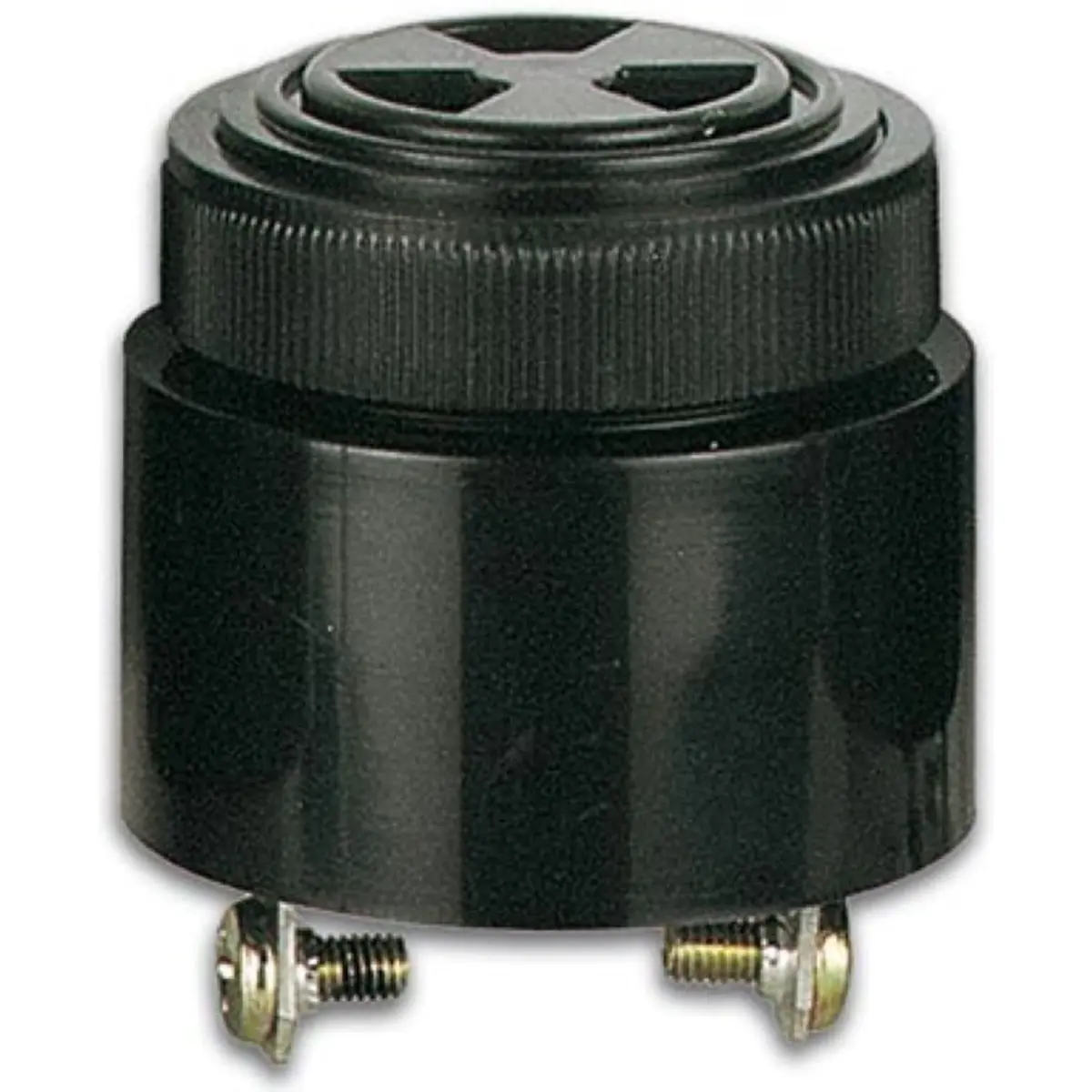 Dispositivo piezoelétrico de tom único com montagem em painel e conectores de parafuso. Alimenta-se entre 3 e 24 VDC (tensão nominal de 12 VDC) e consome 10 mA. Emite um tom a 2,9 kHz com nível sonoro de 95 dB, em corpo preto e peso de 38 g.