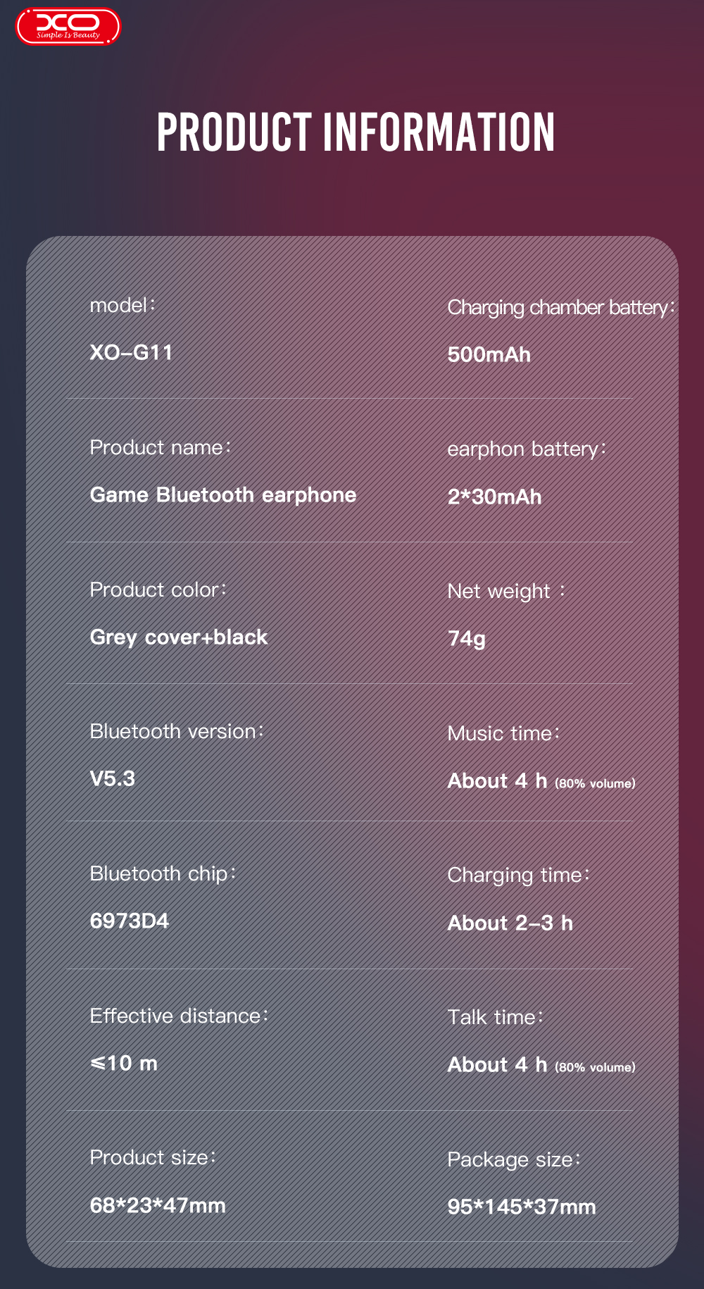 XO G11 são auscultadores Bluetooth 5.3 TWS intra-auriculares com caixa de carregamento. Os auscultadores suportam a tecnologia TWS (True Wireless Stereo) - ambos os auscultadores conectam-se entre si para criar um conjunto estéreo sem fios. Uma caixa portátil com uma bateria incorporada, além da função de carregamento, permite armazenar os auscultadores de forma segura no bolso, mala ou mochila. Liberte as suas mãos e ouça música, rádio pela Internet, enquanto trabalha, caminha, treina ou conduz um carro. Os auscultadores XO G11 TWS são uma solução ideal para utilizadores de smartphones, computadores, portáteis, tablets e outros dispositivos que suportem a tecnologia Bluetooth. São compatíveis com a maioria dos dispositivos Android e iOS. Os auscultadores também possuem um microfone, permitindo realizar chamadas de voz facilmente. A duração das chamadas / audição de música com uma carga completa é de cerca de 240 minutos (dependendo do nível de volume), graças à utilização da tecnologia Bluetooth 5.3 de baixo consumo energético.