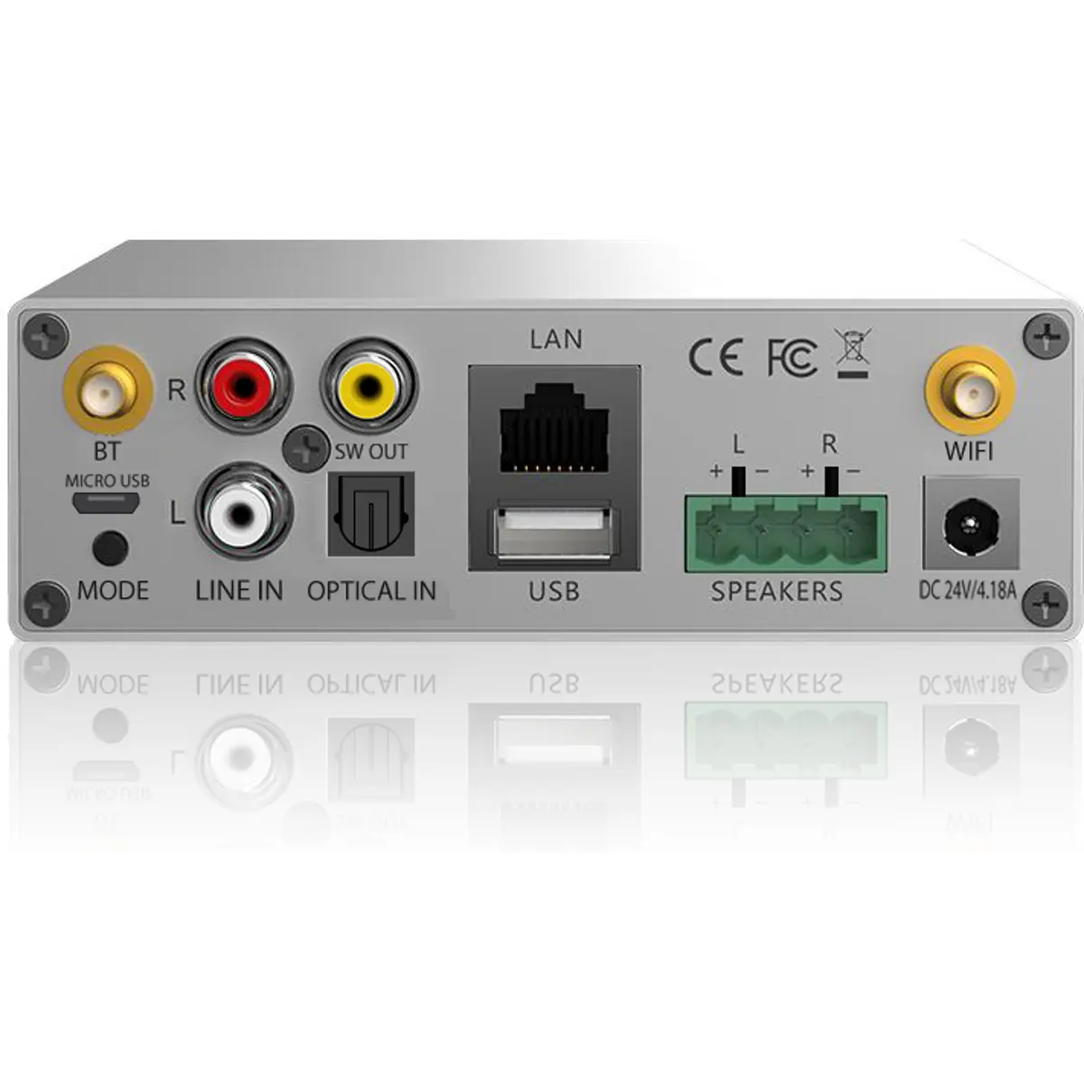 Amplificador digital com 2x50W em 8 Ω, com WiFi, LAN, Bluetooth e USB, controlável por app. Reproduz música de serviços de streaming e de armazenamento local, com sincronização entre várias zonas ou envio distinto por ambiente. Suporta áudio de alta qualidade (FLAC, APE, WAV) sem compressão e streaming via AirPlay, DLNA, UPnP e Spotify Connect. Entradas AUX/RCA e óptica; saída para subwoofer; graves e agudos ajustáveis; 24bit/192kHz; corpo de alumínio com frontal em policarbonato preto; alimentação 30V DC 3A e controlo remoto IR.