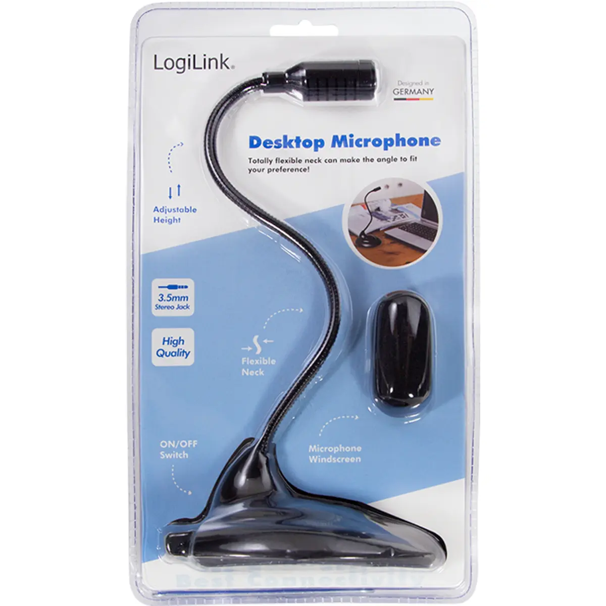 Microfone de alta qualidade com pescoço totalmente flexível, ajustável a qualquer ângulo. Ideal para aplicações em PC ou Mac, com conetor de 3,5 mm e interruptor liga/desliga.
