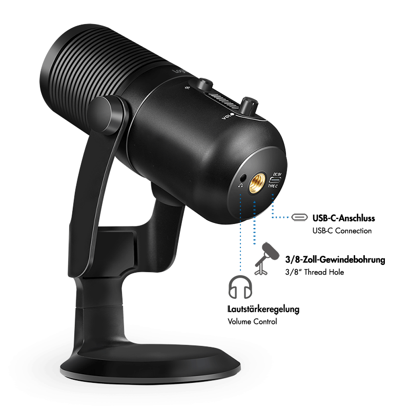 Microfone de alta qualidade com padrão polar cardioide e omnidirecional, ideal para streaming, podcasts, gravações vocais e instrumentais. Suporta taxa de amostragem ultra-alta de 192 kHz@24 bit, com controlo de volume, cancelamento de ruído e monitorização por saída de auscultadores 3,5 mm. Luzes RGB dinâmicas personalizáveis completam o visual profissional.