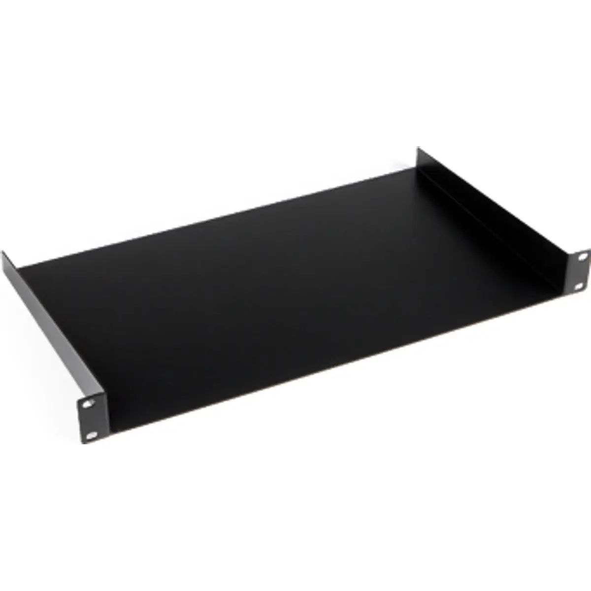 Bandeja metálica para rack de 19 polegadas com montagem frontal e acabamento negro. Possui altura de 1U, largura externa de 483 mm e profundidade de 255 mm, com largura interior de 442 mm para acomodar equipamentos de rede. Inclui parafusos e porcas para montagem, facilitando a instalação em racks padrão. Ideal para salas de servidor e espaços de TI, proporcionando organização, acessibilidade e durabilidade.