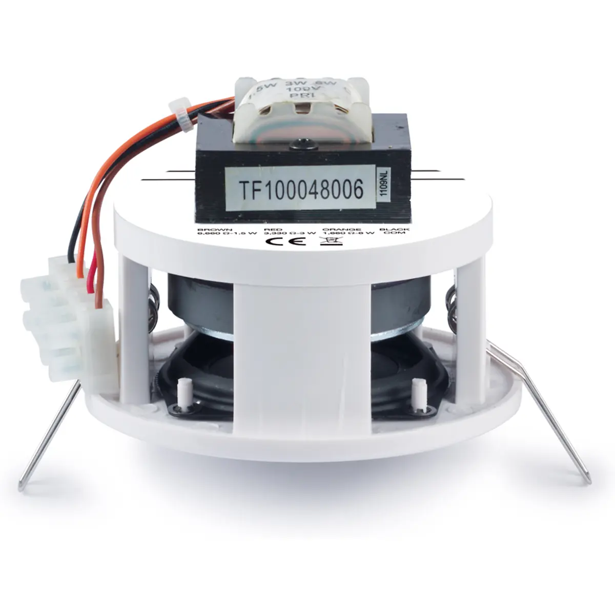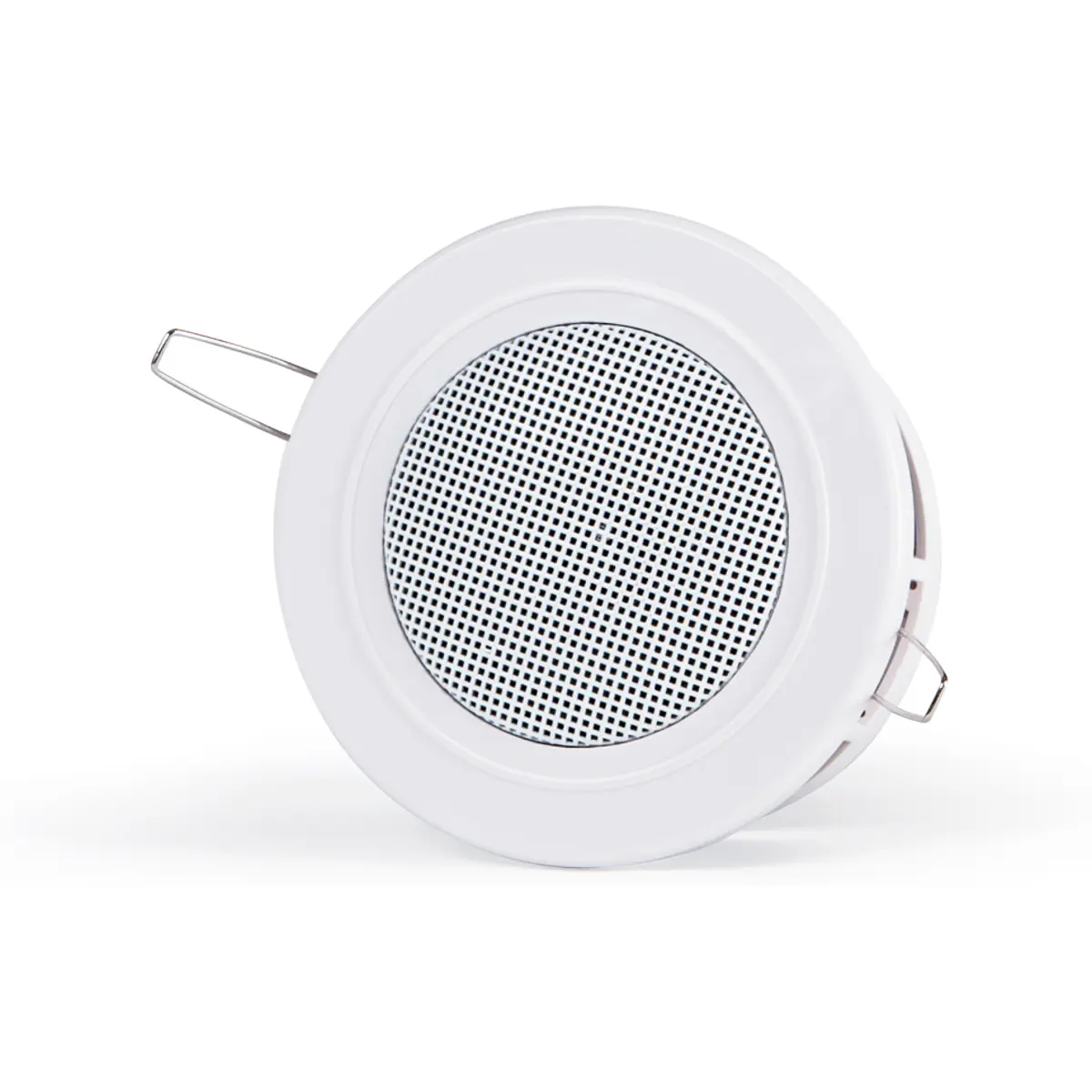 Altifalante de teto com transformador de linha 100 V e grelha redonda. Tamanho semelhante a um foco de halogéneo.