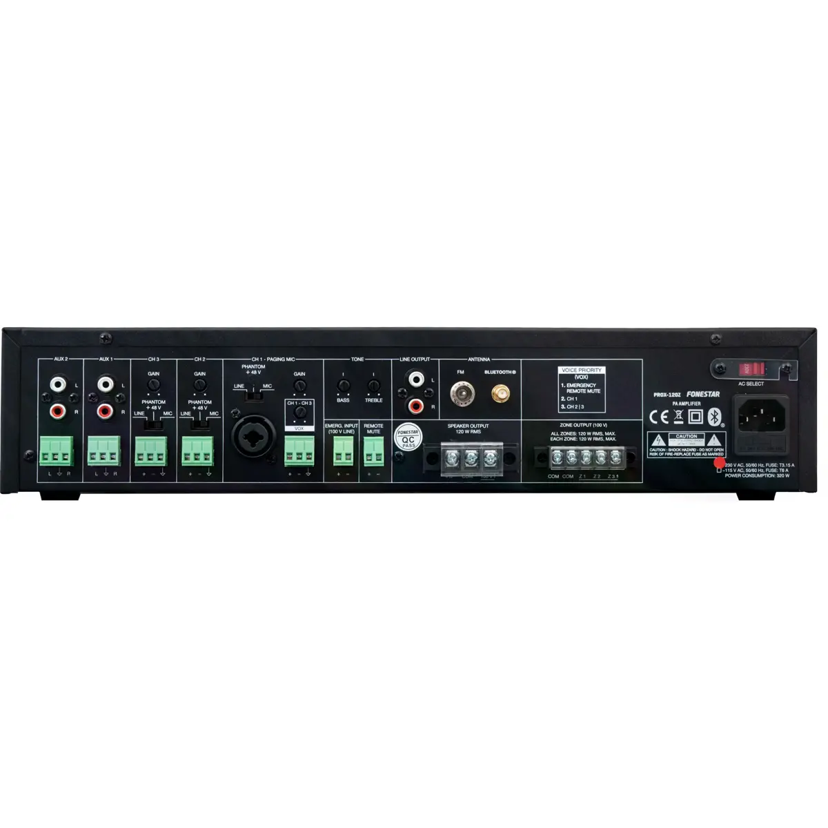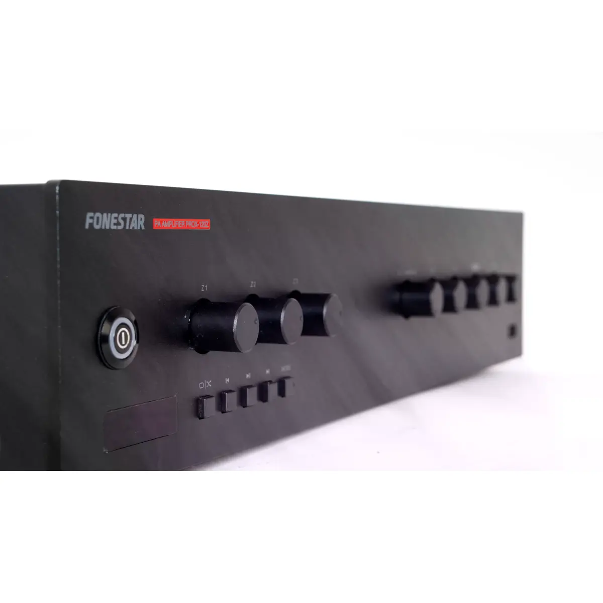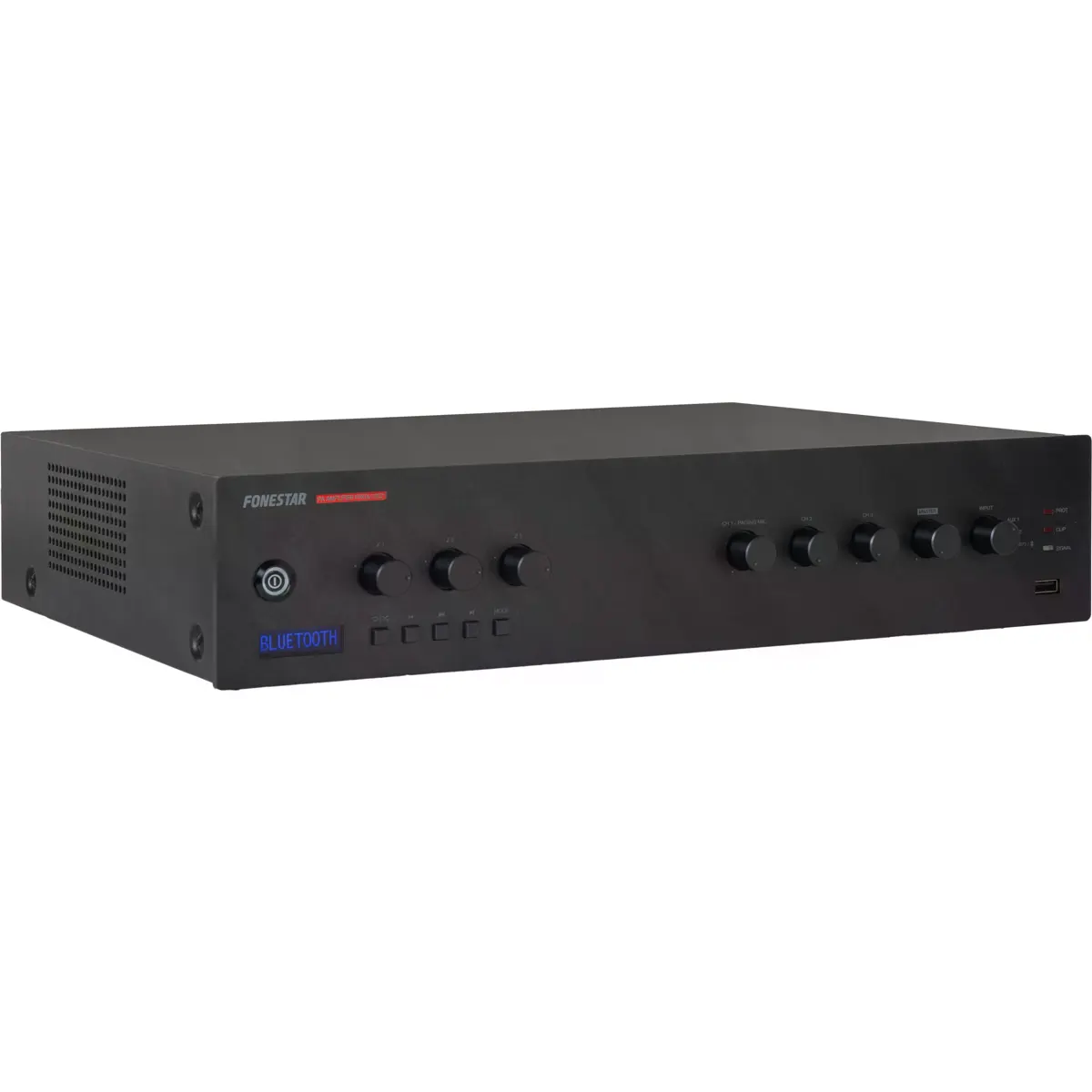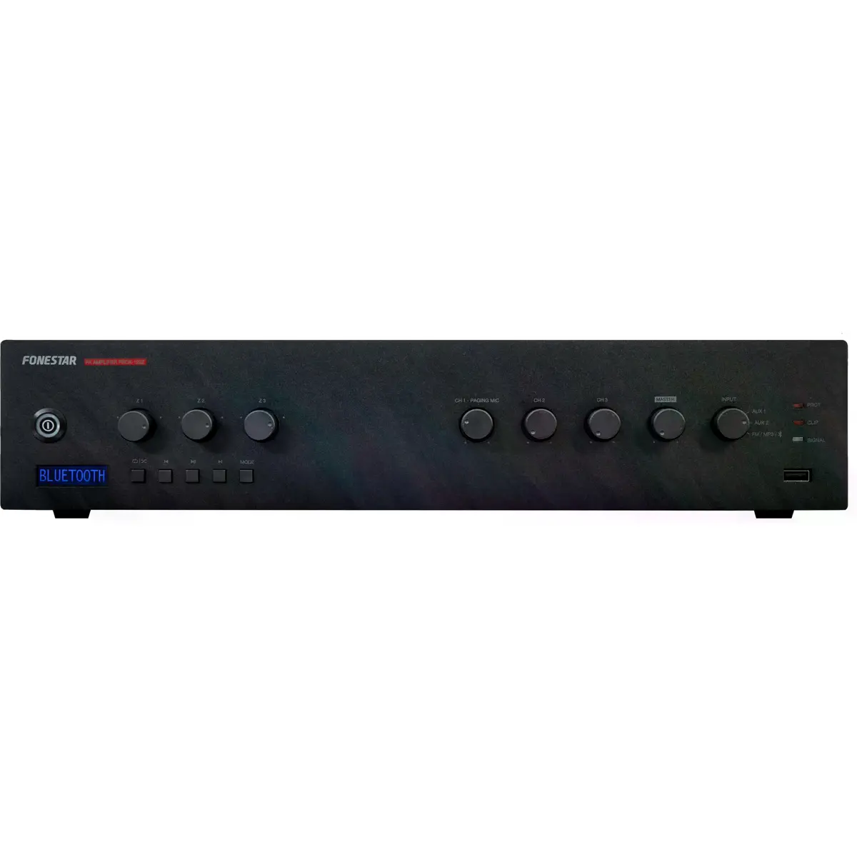 Amplificador de megafonia com reprodutor Bluetooth®/USB/FM e seletor de zonas de colunas.