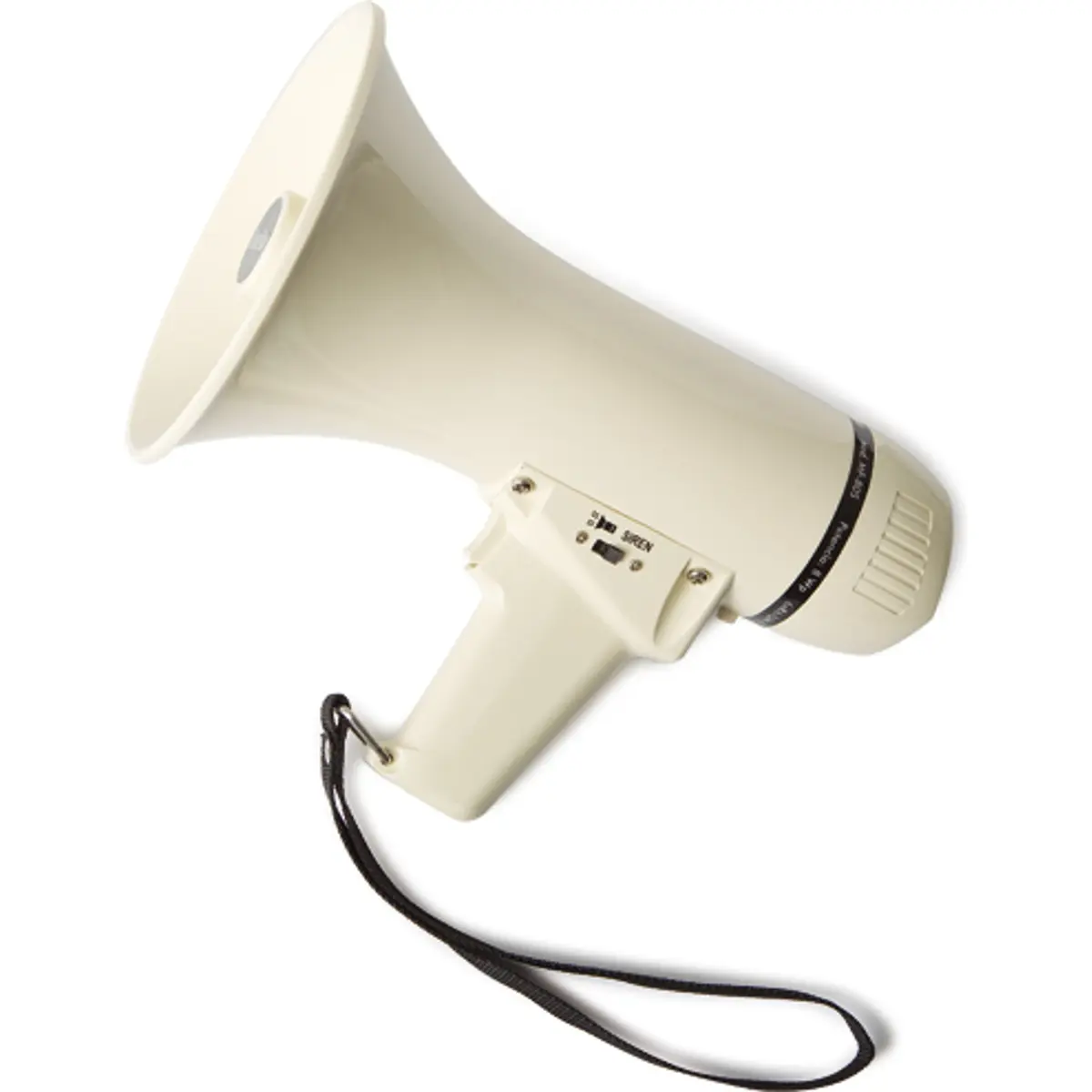 Megafone compacto com sirene integrada, potência de 5 W, alimentado por 6 pilhas LR6-AA, com dimensões Ø150x240mm e peso de 0,7 kg. Oferece emissão de voz clara com sirene, proporcionando comunicação portátil para utilizações em eventos, em locais abertos ou fechados, sem necessidade de alimentação externa.