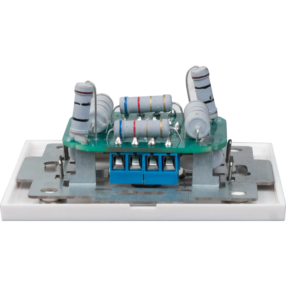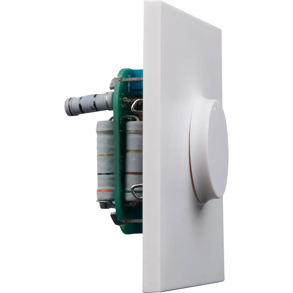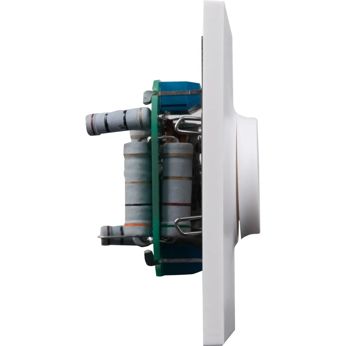 Este atenuador de baixa impedância oferece controlo de áudio estéreo com potenciômetro de 6 posições e função de desativação. Entrega potência máxima de 10+10 W e suporta cargas de 4 a 8 Ω para altifalantes, ideal para caixas quadradas universais. O design compacto (83 x 83 x 48 mm) permite encaixe de 50 x 50 x 30 mm e distância entre parafusos de 60 mm, pesando apenas 0,1 kg, o que facilita a integração em sistemas de áudio.
