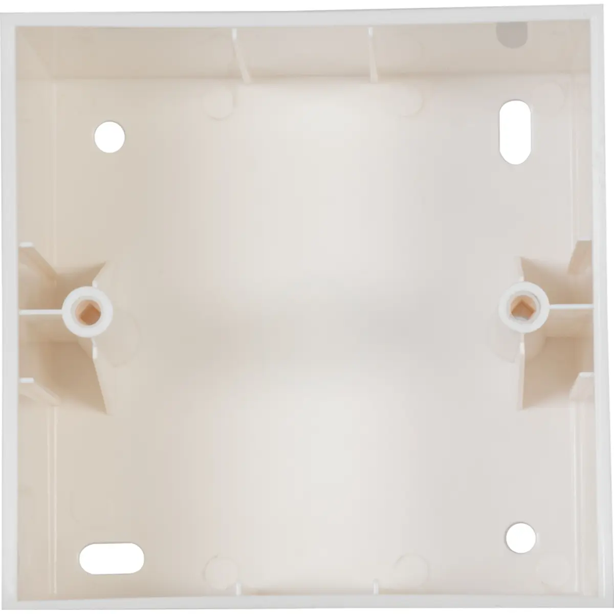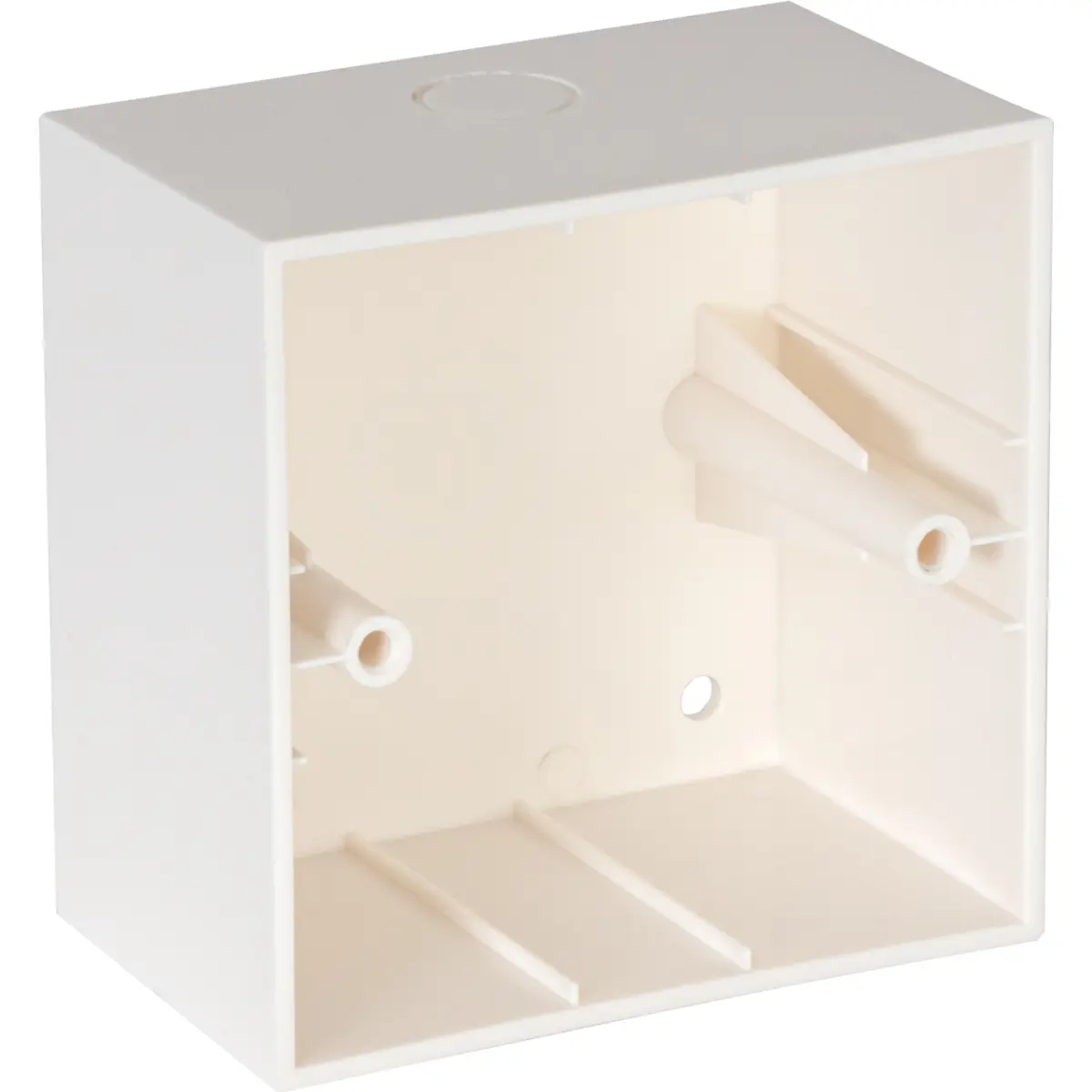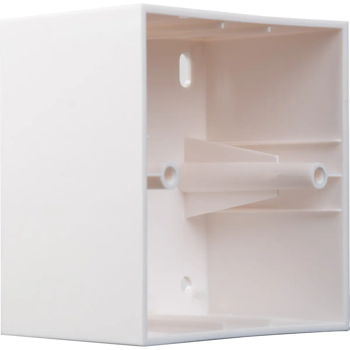 Caixa de instalação à superfície em ABS, compatível com atenuadores DOT-12TR a DOT-210ST, com 83 x 83 x 50 mm de dimensões e distância entre parafusos de 60 mm. Ideal para montagem em superfície, oferece proteção física e isolamento para componentes sensíveis, num acabamento branco. Permite alojamento de diferentes módulos DOT, proporcionando instalação rápida, discreta e segura em ambientes elétricos e de automação.