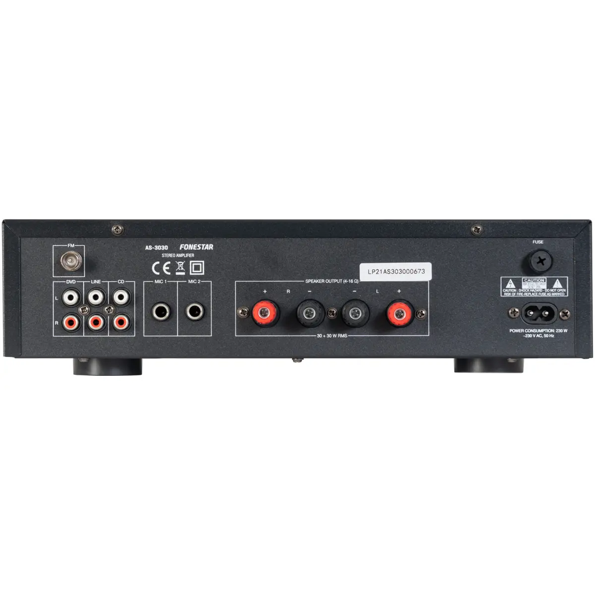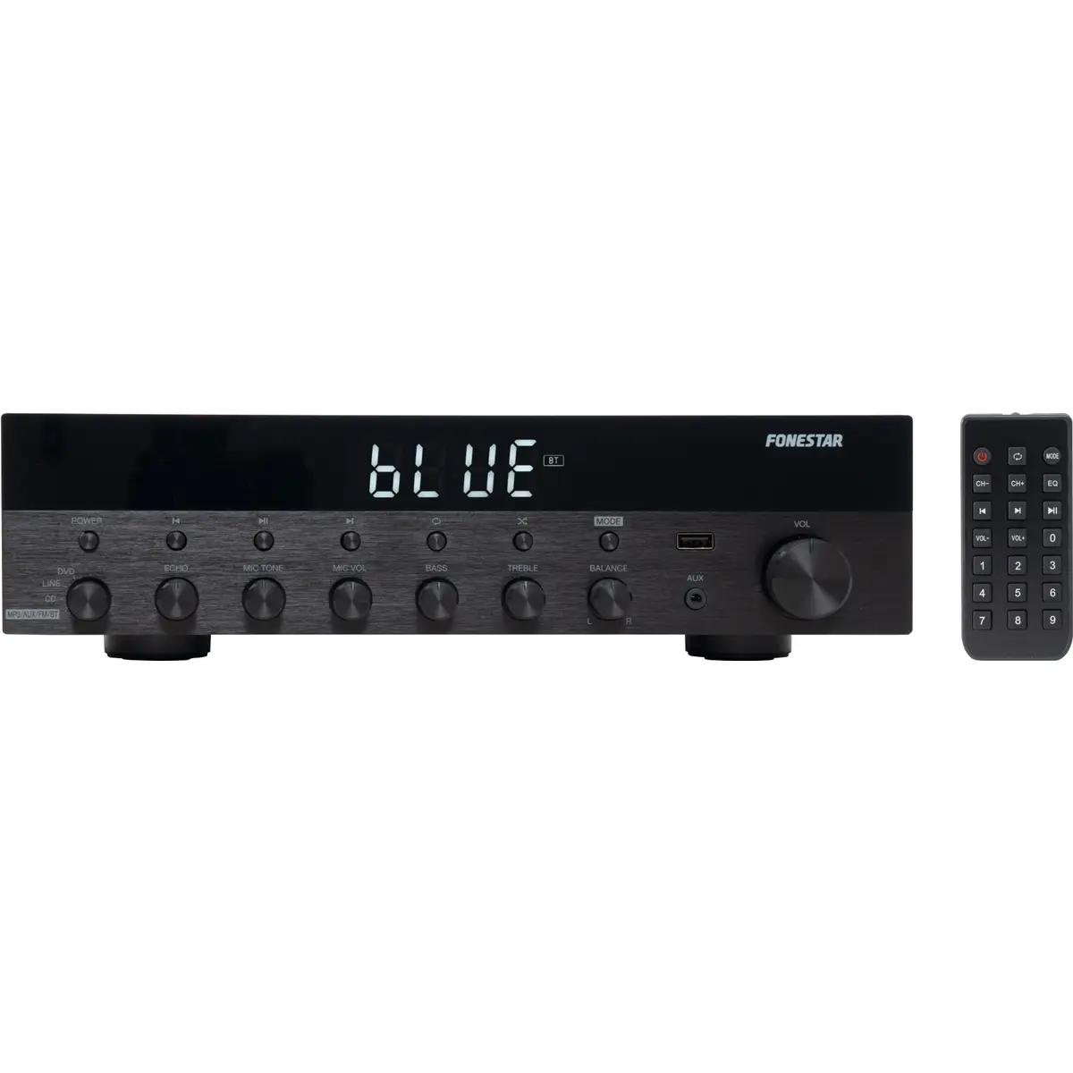 Amplificador estéreo Hi-Fi com Bluetooth, USB/MP3 e rádio FM oferece 30+30 W RMS a 4 Ω. Inclui entradas para microfones com eco, controlo de tom e painel em alumínio, além de controlo remoto. Resposta de frequência de 20-20.000 Hz, relação sinal/ruído > 70 dB e distorção harmónica inferior a 0,5% a 1 kHz. Alimentação 230 V CA, dimensões 330 x 92 x 276 mm, peso 3,3 kg.