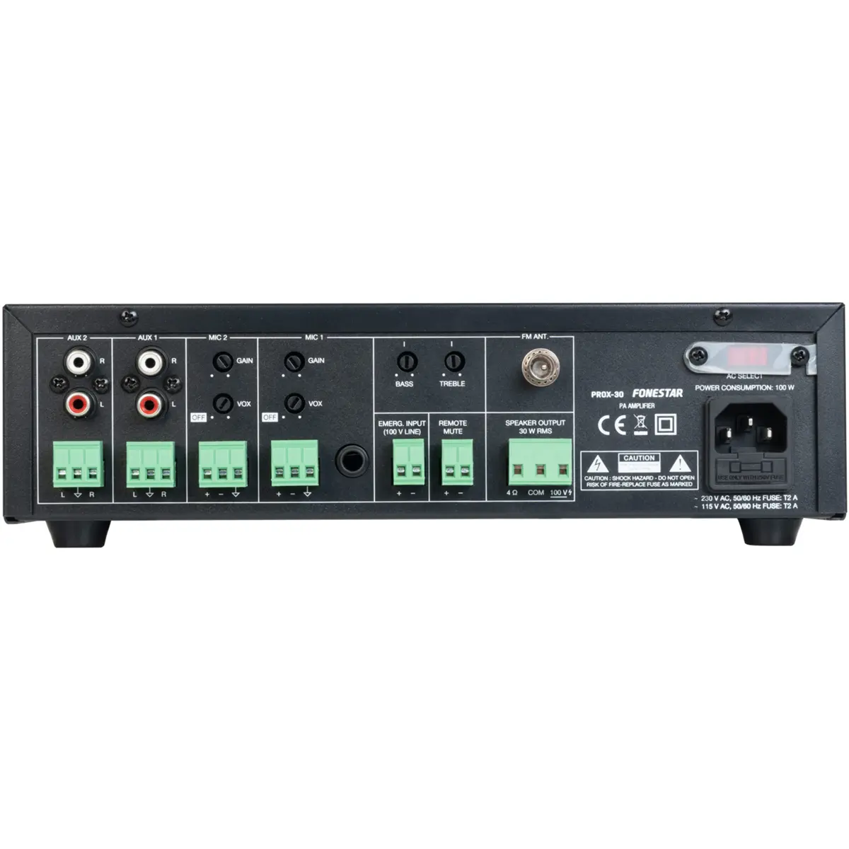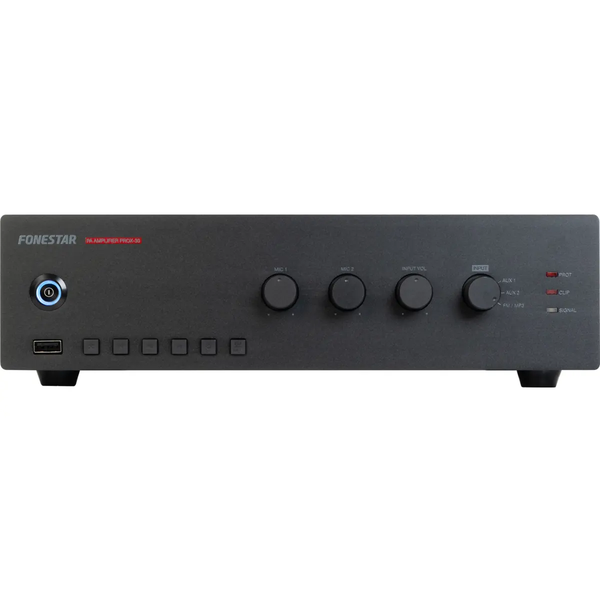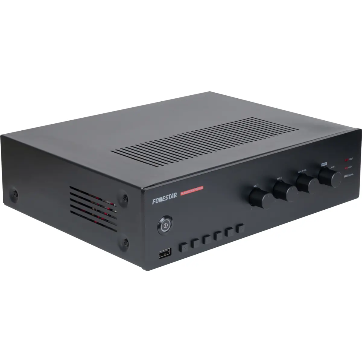Amplificador com reprodutor USB/FM, para sistemas de megafonia e música ambiente com colunas de linha 100 V ou baixa impedância. Espaços comerciais, centros educativos, monumentos, exposições, bares, restaurantes, etc.