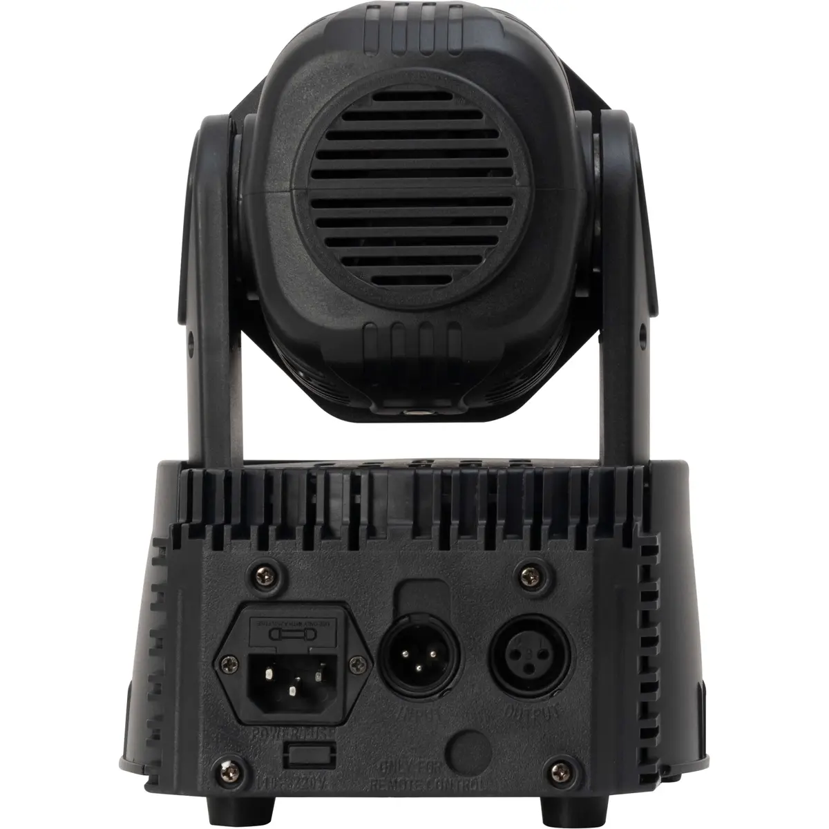 A cabeça móvel LED RGBW oferece iluminação de cenários com 7 LEDs de 10 W e RGBW. Possui grande amplitude de movimento: pan 540° e tilt 180°, com modos automático, por som ou DMX (9 ou 14 canais). Controles através de ecrã integrado, entradas e saídas DMX (XLR de 3 pinos) e alimentação 100-240 V CA a 150 W. Corpo em metal e plástico negro com refrigeração por ventilador, instalação em cascata e pés de borracha para montagem estável.