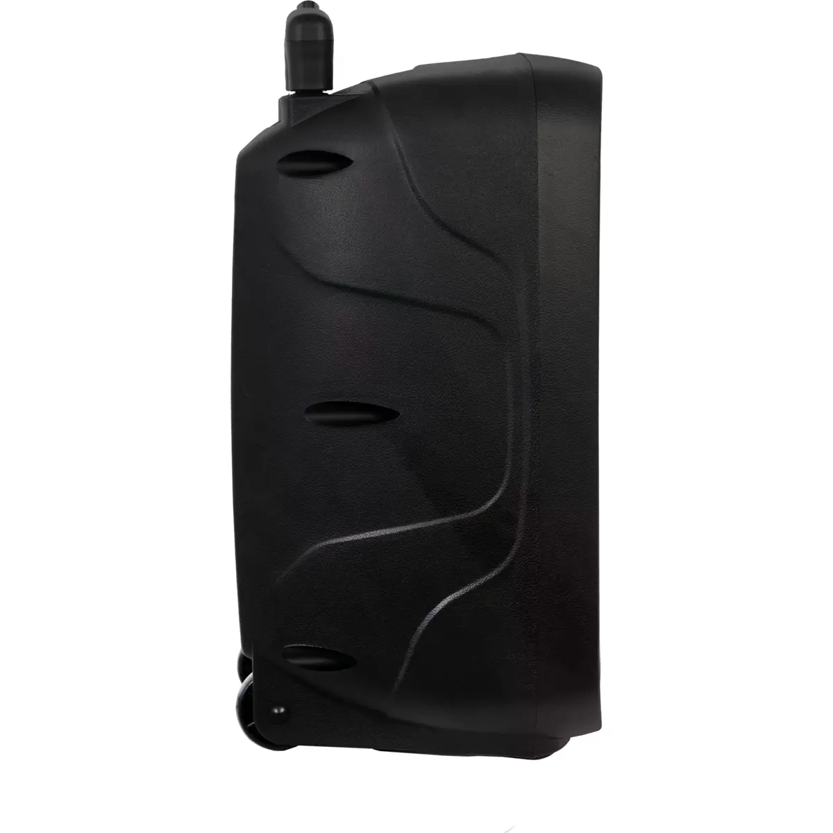 A coluna amplificada portátil oferece 100 W de potência com Bluetooth, USB, microSD, FM e entrada LINE, incluindo um microfone sem fios de mão UHF. Com Bluetooth 5.0, karaoke com Voice Canceller, priorização de voz e controlo independente de música e microfones, permite gravação do áudio do microfone e emparelhamento TWS para estéreo. Possui carrinho de transporte, bateria Li‑ion e sistema de graves BASS REFLEX, ideal para festas, apresentações e aulas até 20 pessoas, com configuração simples.