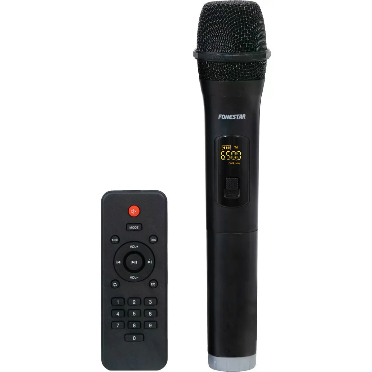 - Coluna portátil com microfone sem fios de mão UHF (650 MHz).