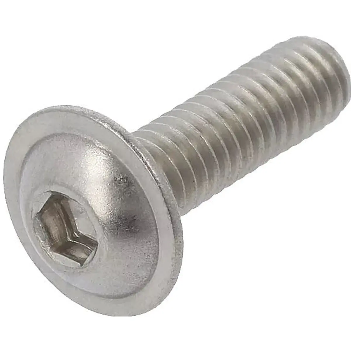 Parafuso com flange em aço inoxidável A2, rosca métrica M6, comprimento de 8 mm e cabeça esférica com fenda HEX4. Possui passo de rosca 1, diâmetro da cabeça de 13,6 mm e altura de 3,3 mm, oferecendo montagem estável em estruturas com flange. Compatível com a norma ISO 7380-F, oferece boa resistência à corrosão, instalação fácil com chave HEX4 e fixação segura em montagens mecânicas onde é necessária flange.