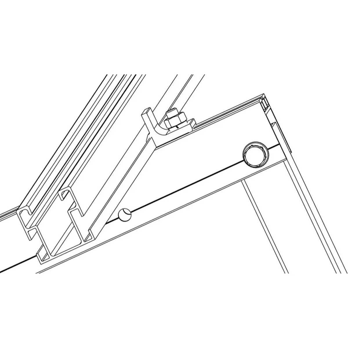Conector transversal para estruturas triangulares de alumínio que liga dois perfis de fixação com pré-tensão elevada, sem interferir nas funções do perfil. O kit pré-montado permite fixação lateral em perfil de alumínio, usando apenas um parafuso M8 DIN-933. Inclui perfil extrudado em liga 6005T6 com acabamento anodizado, parafuso DIN-933, anilha DIN-127 e porca DIN-934 em aço inoxidável A2-70. Adequado para uso exterior, com ranhura guia na asa vertical para furos de junção longitudinal. Permite montagem rápida, ajuste facilitado pelo anel em mola e desmontagem sem danificar elementos, com torque máximo de aperto de 14 Nm.