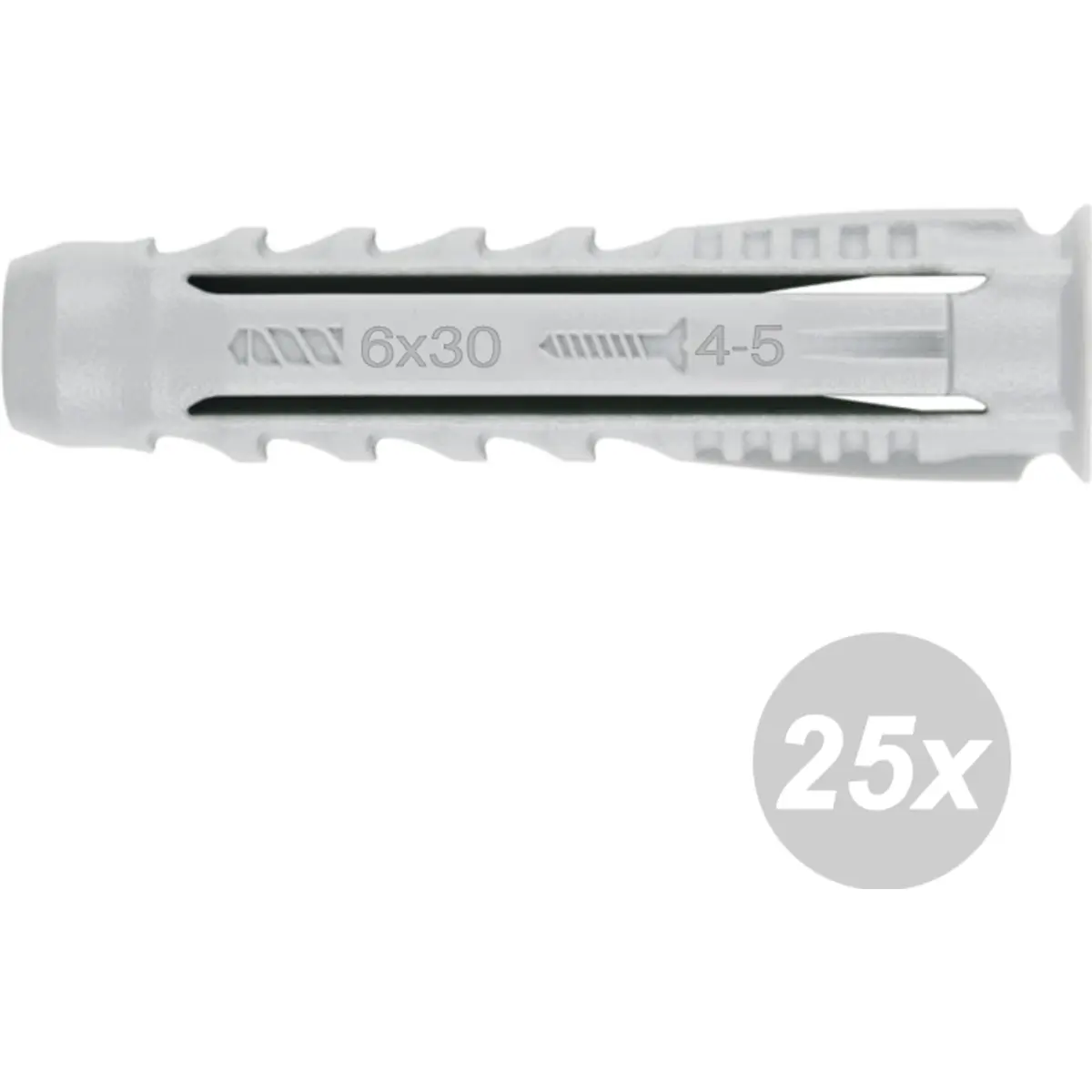 Bucha de nylon Ø6x30 mm, com quatro segmentos, oferece fixação segura em materiais maciços e ocos. O sistema antirotação e a expansão uniforme em quatro direções aumentam a estabilidade. Possui marcações de instalação com diâmetro da broca, profundidade de perfuração e diâmetro recomendado do parafuso, facilitando a montagem. Compatível com parafusos TPPO 4-5; blister com 25 unidades, ideal para construção e remodelação.
