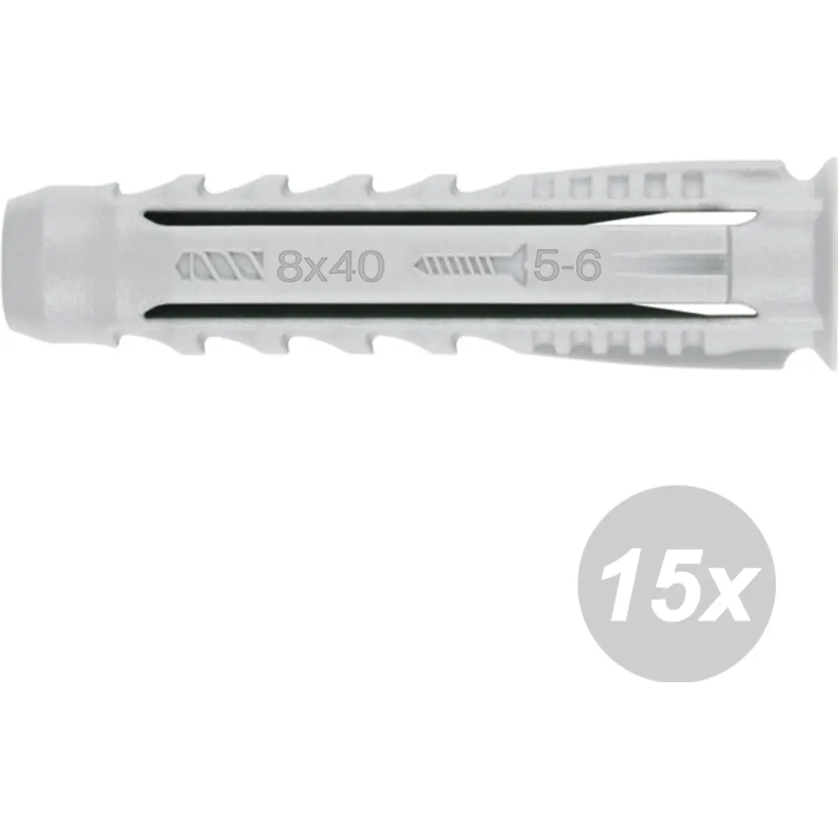 Bucha universal de nylon para materiais base maciços e ocos, com expansão uniforme em quatro direções e sistema anti-rotação para fixação estável. Compatível com diâmetro de broca, profundidade de perfuração e diâmetro do parafuso recomendado; atende parafusos TPPO 4,5 e TB 5-6. Conteúdo em blister com 15 unidades.