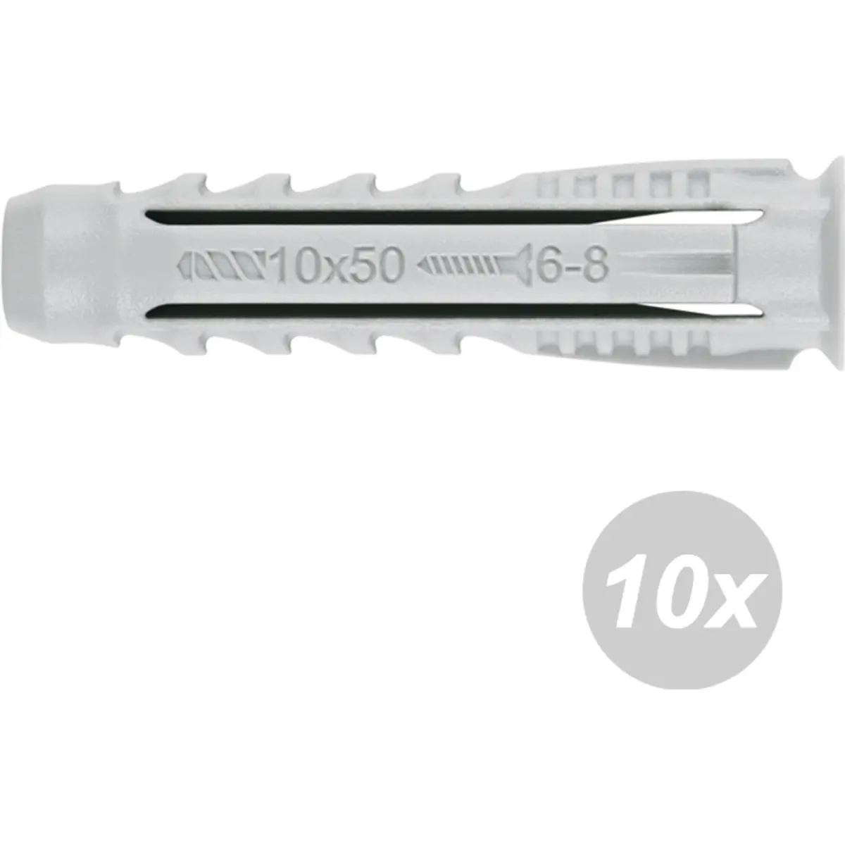 Esta bucha nylon de 4 segmentos universal Ø10x50mm é adequada para materiais base maciços (betão, pedra, tijolo maciço) e ocos (tijolo oco, bloco oco, gesso cartonado). Possui sistema anti-rotação para fixação segura em qualquer tipo de material e expansão uniforme em 4 direções, garantindo maior estabilidade. Apresenta marcações de instalação com diâmetro de broca, profundidade de perfuração e diâmetro do parafuso recomendado (TB 6-8). Blister com 10 unidades.