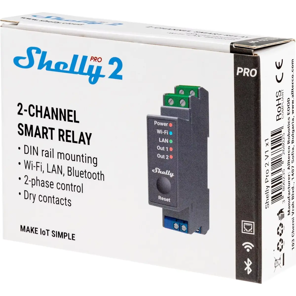 O Shelly Pro 2 é um módulo de relé para calha DIN com dois canais de 16 A (máximo total de 25 A) e alimentação 110-240 V AC. Oferece conectividade Wi‑Fi, LAN e Bluetooth, controlo local e remoto, e suporte a automação via scripts (mJs). Suporta Webhooks HTTP/HTTPS, MQTT e scheduling (50 eventos) com 20 URL Actions, permite criação de cenas e automatiza com base no nascer e pôr do sol. Montável em calha DIN, compacto e seguro.