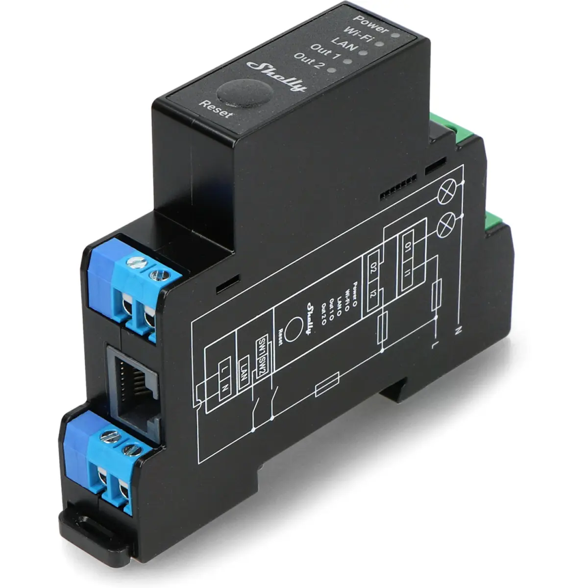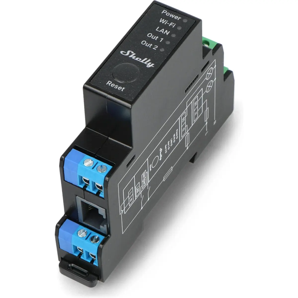 O Shelly Pro 2PM é um relé profissional de 2 canais, suportando até 16A por canal com capacidade total do dispositivo de 25 A. Possui conectividade Wi-Fi, LAN e Bluetooth, ideal para automação residencial e instalações controladas remotamente.