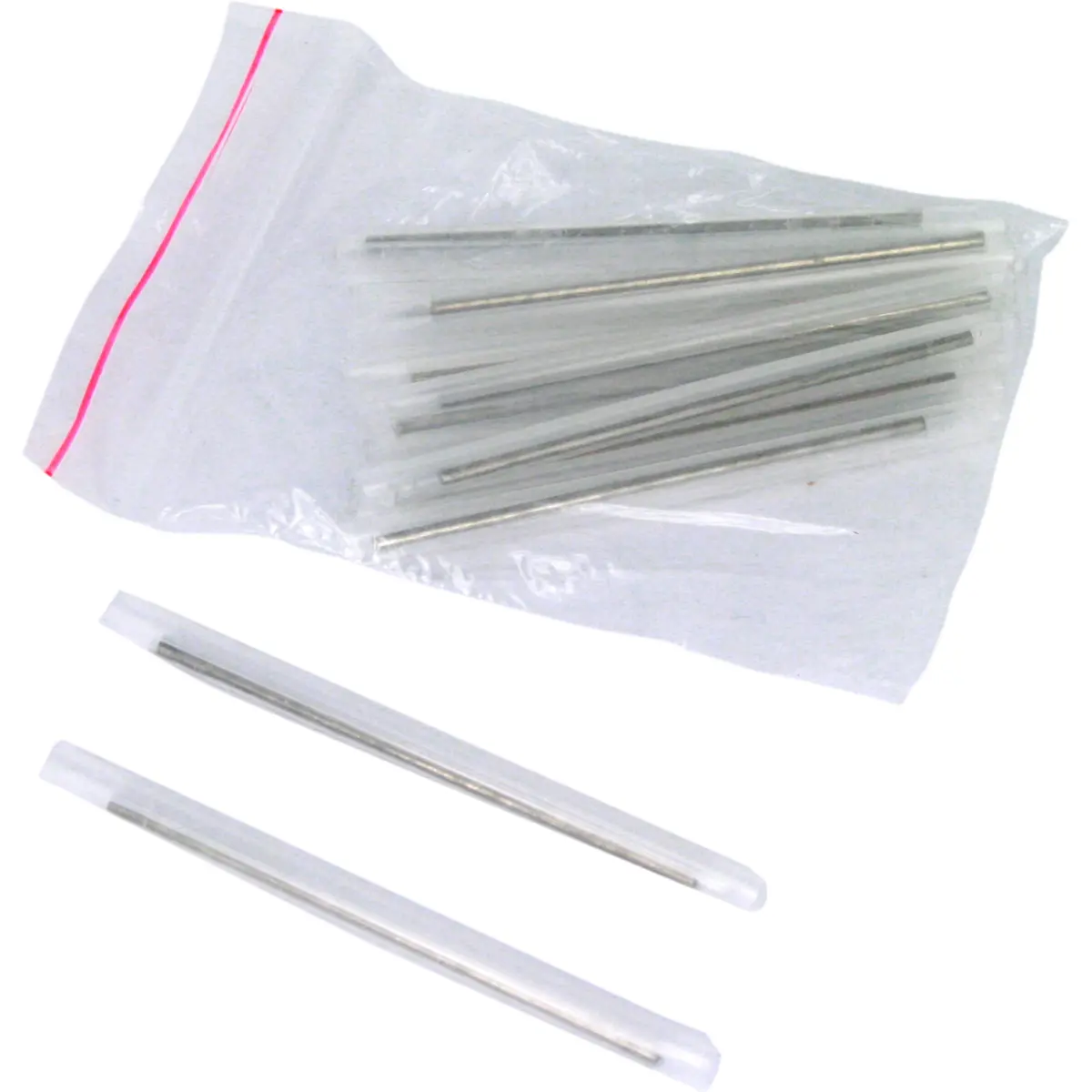 Proteções termo-retráteis com reforço metálico para fusão óptica, em 50 unid. de 45mm, transparentes. Concebidas para proteger ligações ópticas durante a fusão, oferecendo proteção mecânica adicional e facilitando a instalação em cabos de fibra.