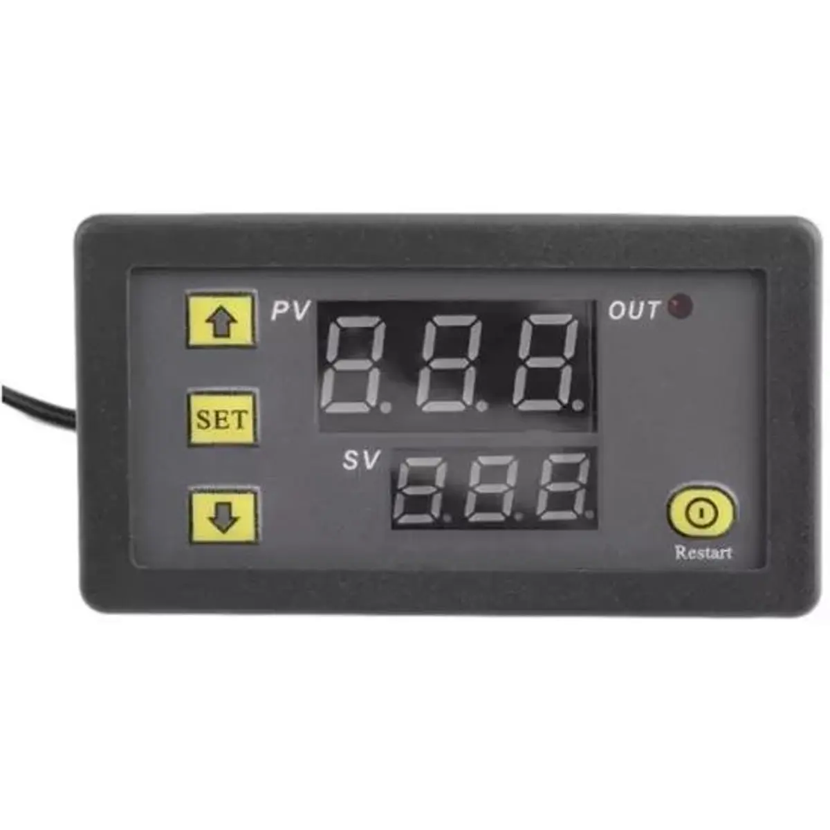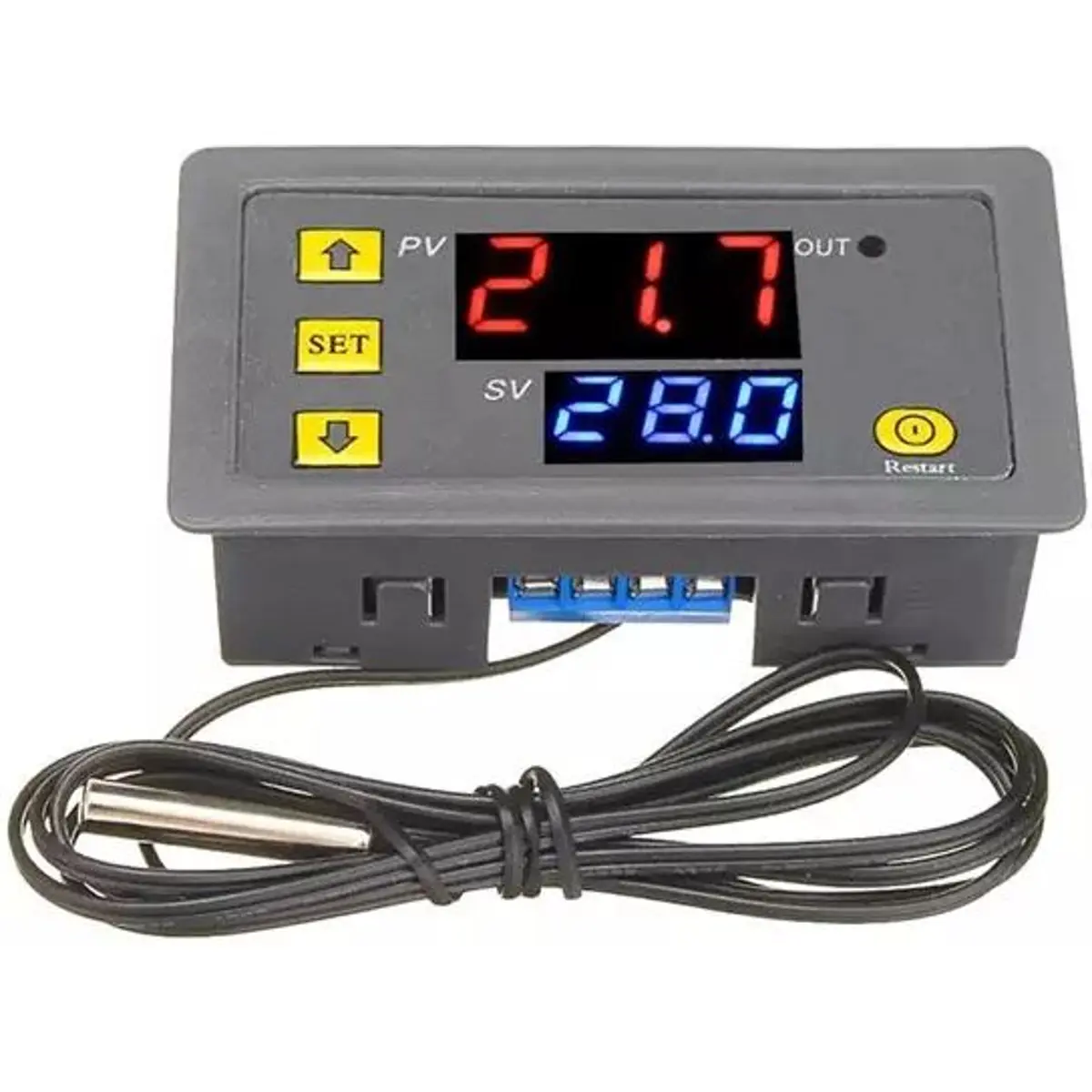 Um termostato simples que exibe a temperatura definida e atual. A caixa compacta do painel contém botões no visor. Cabo de 1m com sonda.
