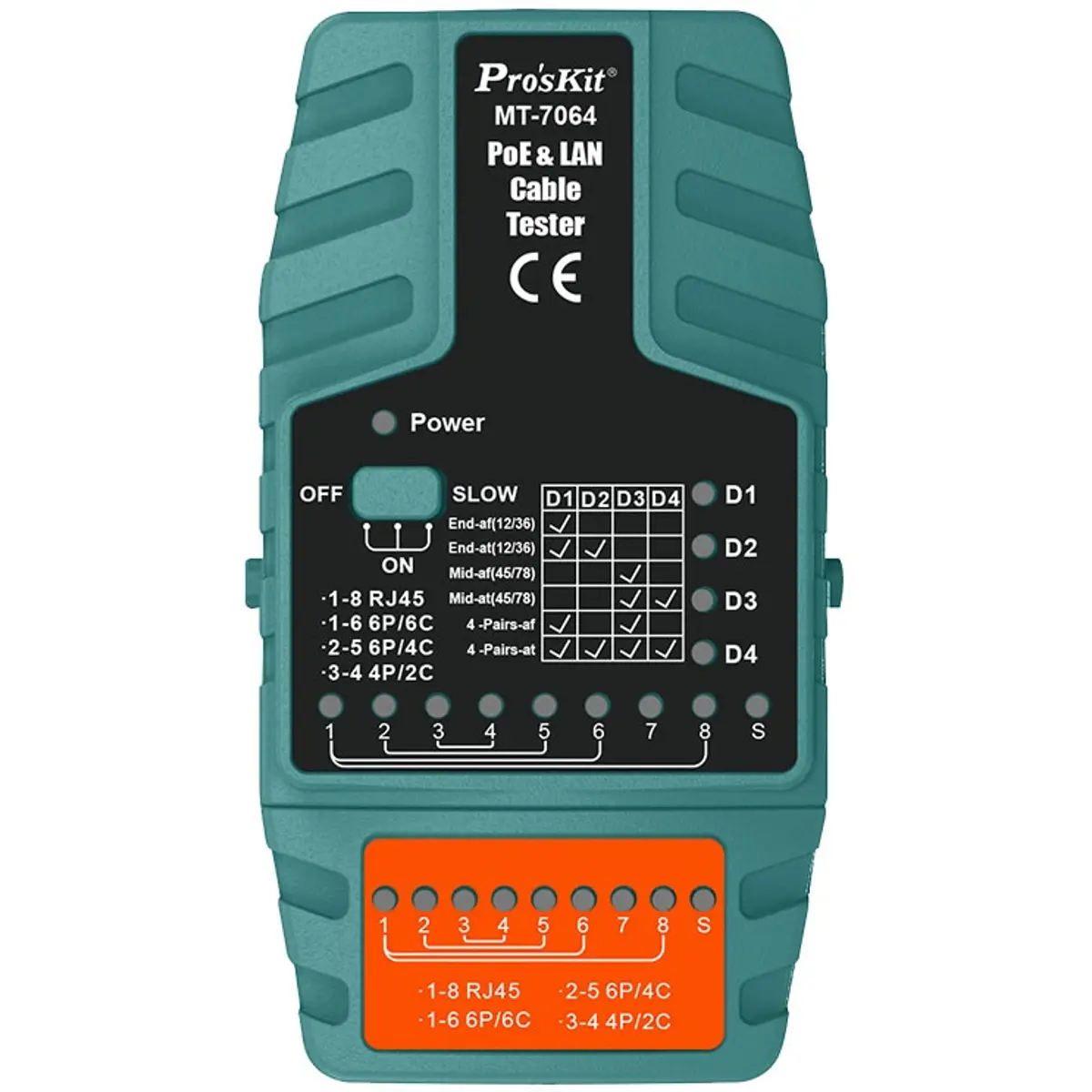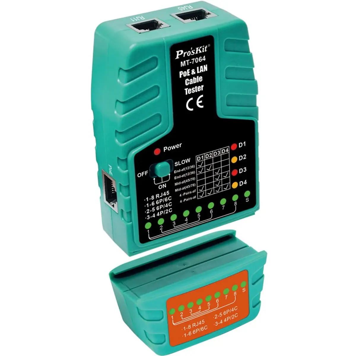 Testador universal que verifica o estado das ligações de rede LAN com fichas RJ45, RJ11 e RJ12, bem como se essas ligações recebem PoE (Power over Ethernet) e o tipo de padrão PoE.
