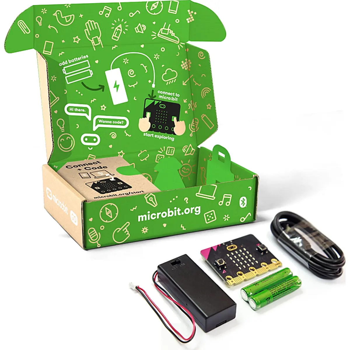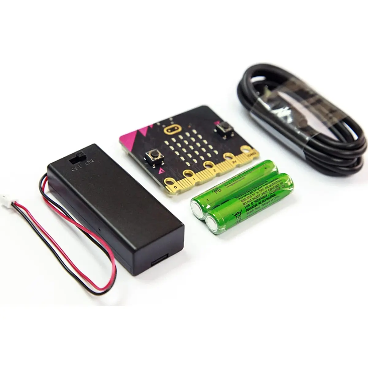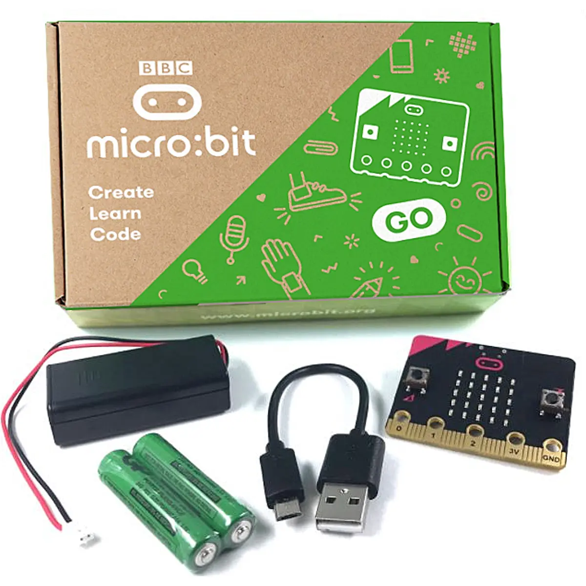 O BBC micro:bit é um computador de bolso projetado para tornar a codificação divertida e fácil de aprender. O Micro: Bit GO v2 inclui 1 placa micro: bit v2.2, 1 cabo USB, 1 suporte de bateria e 2 baterias AAA.