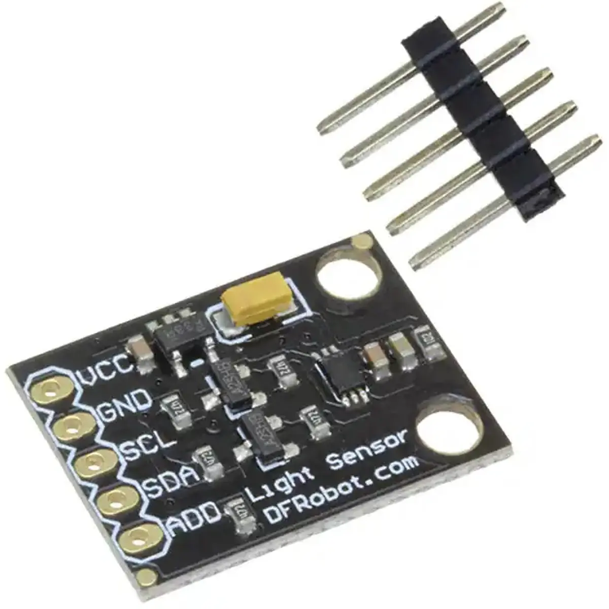 Este módulo sensor de iluminância fornece leituras digitais de lux via I2C com conversor de 16 bits e alcance até 65.535 lx. Opera entre 3 e 5 V, suporta dois endereços I2C, tem dimensões compactas (21 x 16 x 3,3 mm) e inclui uma barra de 5 pinos para soldar. Ideal para monitorização de iluminação, automação e aplicações de domótica que exigem leitura precisa de luminosidade.