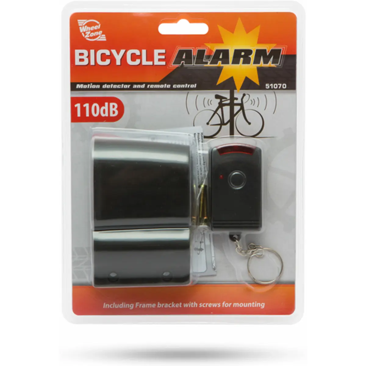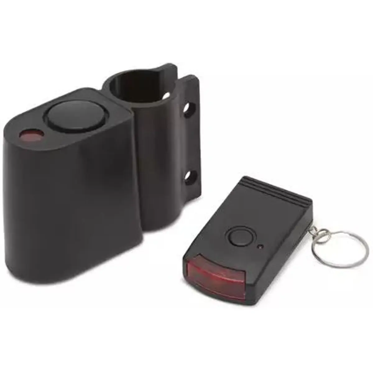 Alarme de bicicleta com controlo remoto que ativa uma sirene de alta potência de 110 dB ao detetar movimento. O alarme tem duração de 30 segundos por ciclo e reinicia automaticamente com novo movimento. O sistema fixa-se com parafusos, possui impermeabilidade limitada e deve ser montado debaixo do assento. Fabricado em plástico, necessita de 1 pilha de 9V (não incluída) e 3 pilhas LR44 (incluídas). O receptor mede 95 x 63 x 36 mm e o controlo remoto 59 x 34 x 14 mm.