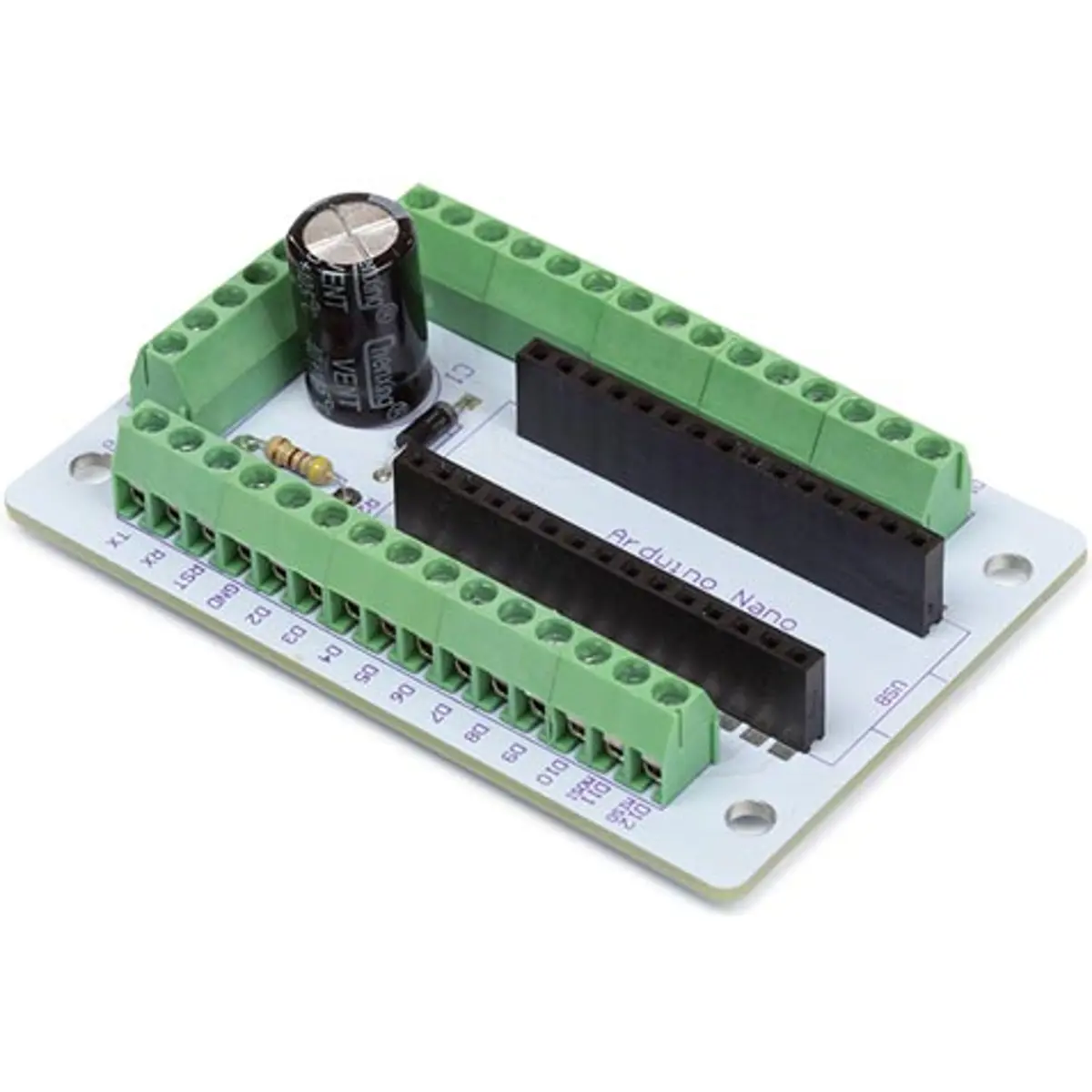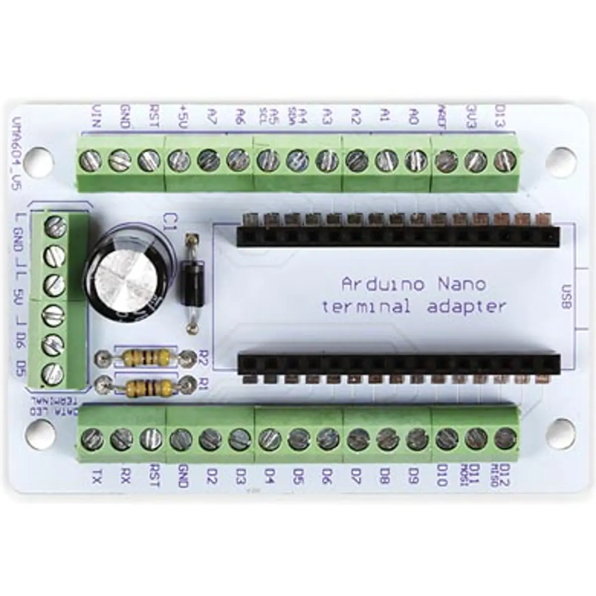 Este adaptador de terminais foi projetado para permitir fácil acesso a todos os pinos de interface de um ARDUINO® NANO através de blocos de terminais de parafusos.