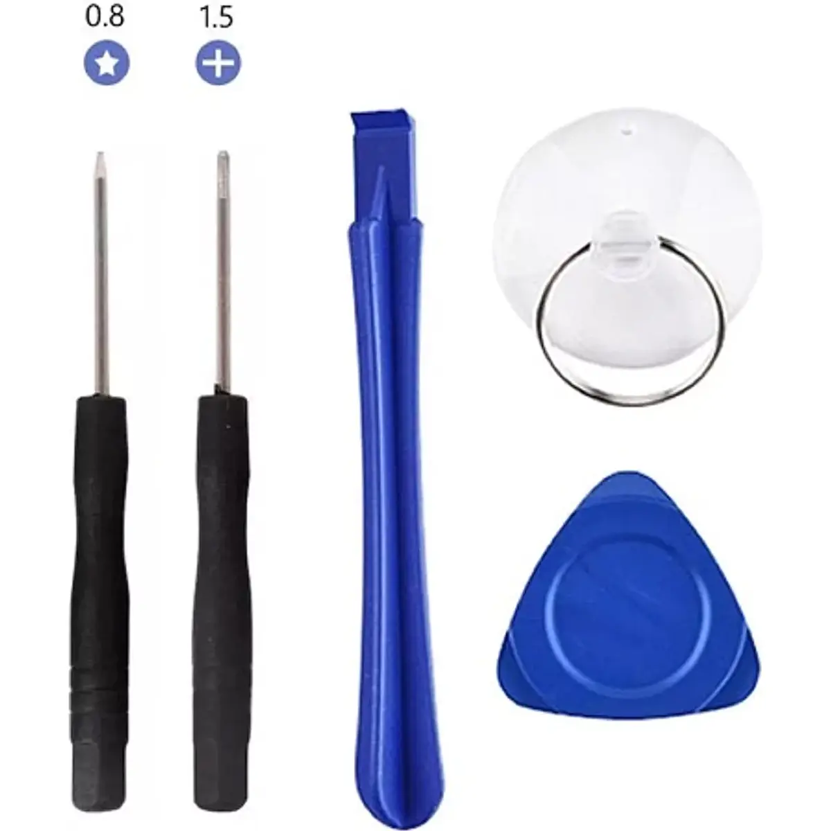 Kit de ferramentas básicas universais para abertura de iPhones 4/5/6, com ventosa para descolar o ecrã, palhetas plásticas, alavancas de 85 mm e chaves de precisão: star 0,8 mm, fenda 2 mm e Phillips 1,5 mm. Ideal para técnicos e entusiastas, permite desmontar ecrãs, conectores e componentes internos com um conjunto compacto, portátil e reutilizável para reparações cuidadosas.