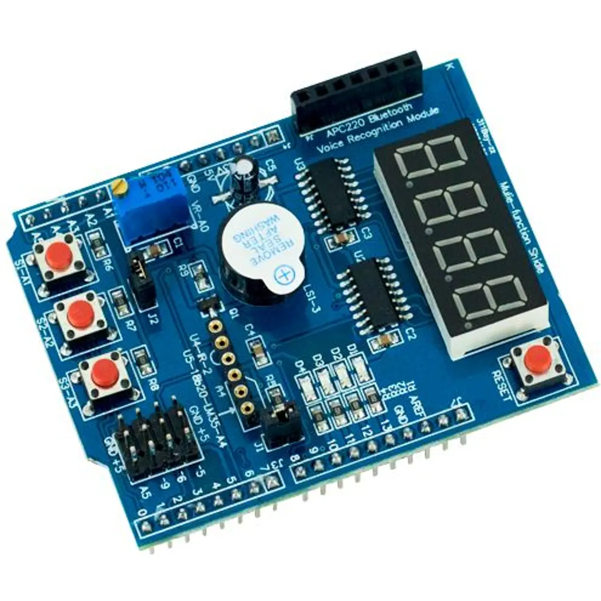 O shield conta com display 7 segmentos de 4 dígitos (ideal para você tirar do papel aquele projeto de relógio com Arduino), potenciômetro, botões, buzzer, saídas para sensores de temperatura LM35 e DS18B20, conector para módulo APC220, wireless, bluetooth e outros.