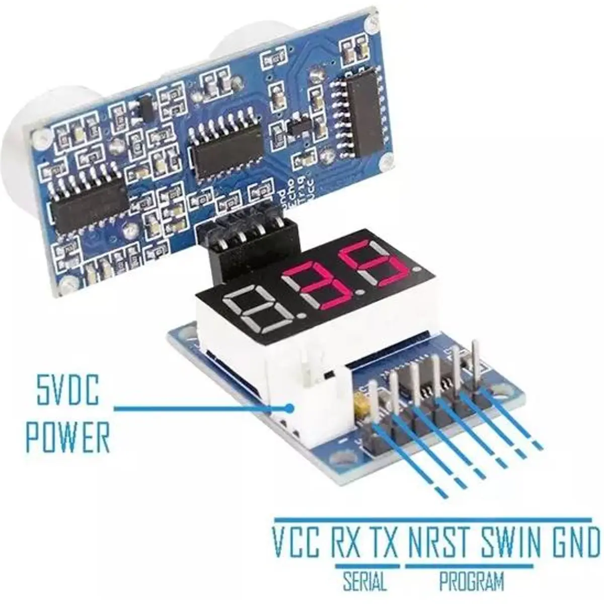 Este módulo de apoio é compatível com o sensor de distância ultrassónico HC-SR04, apresentando um ecrã de 3 dígitos que indica a distância em centímetros. O dispositivo incorpora um microcontrolador STM8S103 de 8 bits, pinos TX/RX para dados e pinos NRST e SWIM para download de programas. Alimentado por 5VDC e com dimensões de 25 × 36 × 12 mm, é adequado para aplicações em robótica, medições de distância e automação que requerem leitura rápida e montagem simples.
