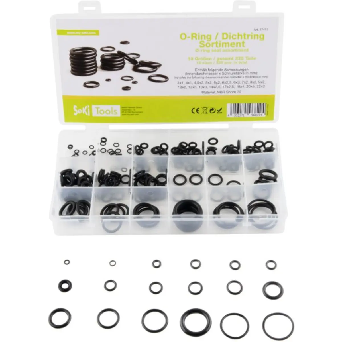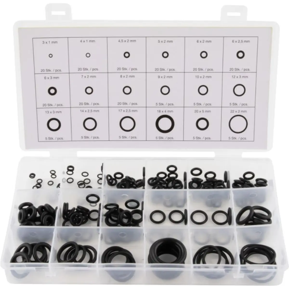 Kit de vedação com 225 O-Rings NBR organizado em 18 tamanhos diferentes, do Ø3x1mm ao Ø22x2mm. Ideal para substituição de juntas e vedação em máquinas, automóveis, eletrodomésticos e aplicações industriais leves. Os anéis de borracha nitrílica oferecem boa resistência a óleo e temperaturas moderadas, garantindo vedação estável em diversas situações. A variedade de diâmetros facilita o ajuste correto, evitando compras desnecessárias e simplificando a gestão de peças sobressalentes. Material durável e fiável para manutenção e reparações rápidas.