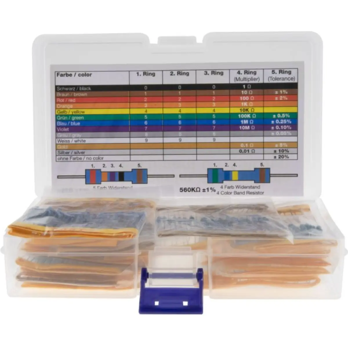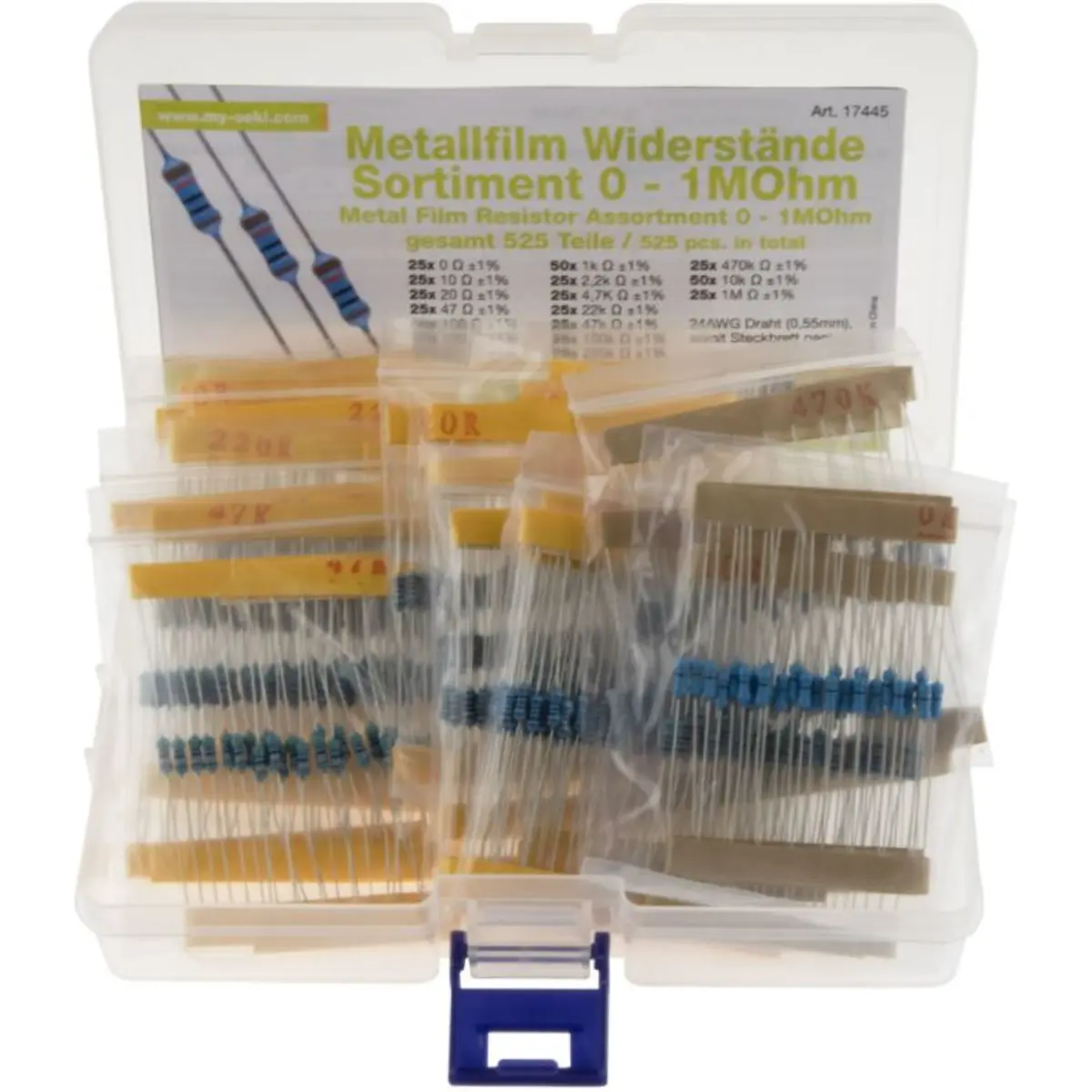 O Sortido inclui 525 resistências de 1/4W (1%) de filme metálico:
