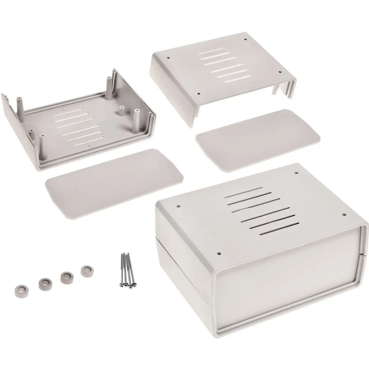 Caixa de dimensões 110 x 150 x 70 mm, cinzenta, com carcaça de poliestireno e painel. Tamanhos: X 110 mm, Y 150 mm, Z 70 mm.
