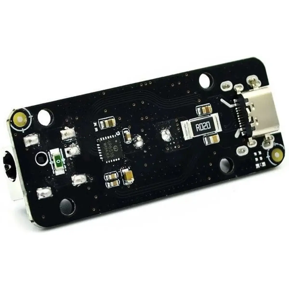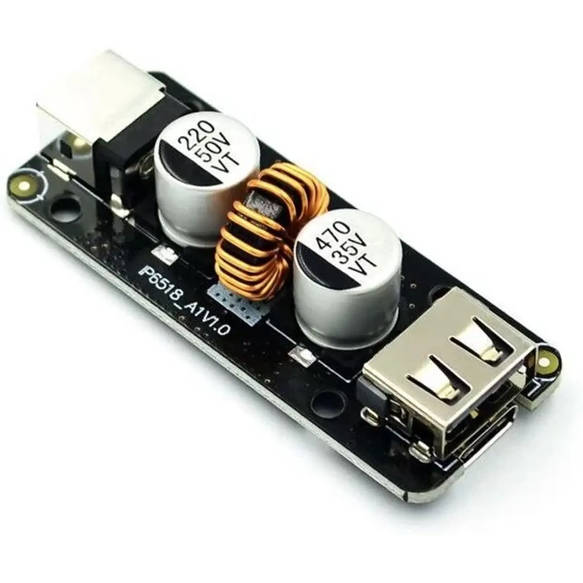 Este módulo de carregamento rápido possui uma porta USB Tipo-A e outra Tipo-C. Suporta uma entrada de tensão de 10.5 a 32V e saída de 3A com tensão automaticamente ajustada aos vários protocolos de carregamento suportados.