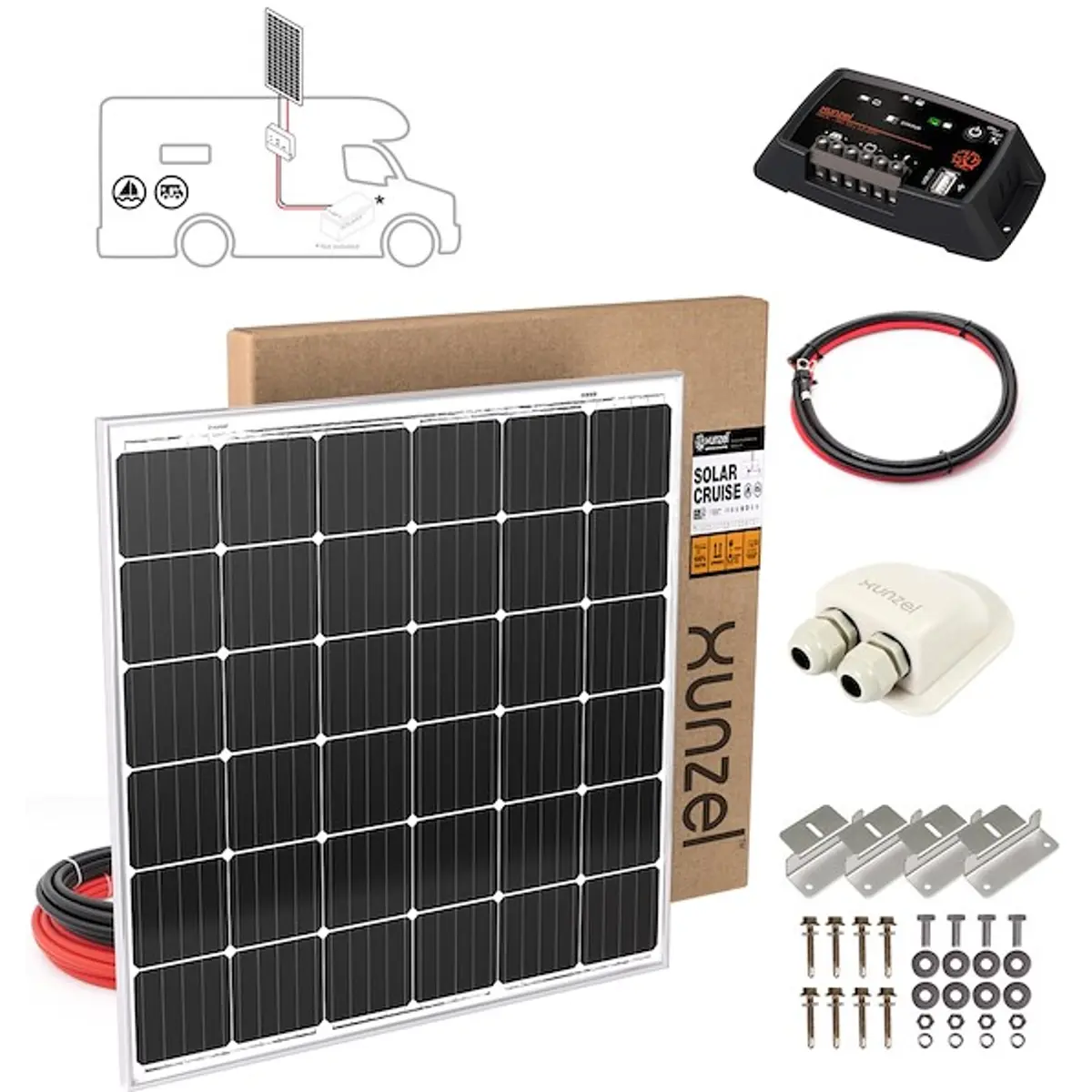 KIT Fotovoltaico para Caravana/Veículos/Barcos completos com alta capacidade de geração de energia para carregamento de baterias de serviço. Com controlador de carga e descarga solar com saída USB com função crepuscular programável.