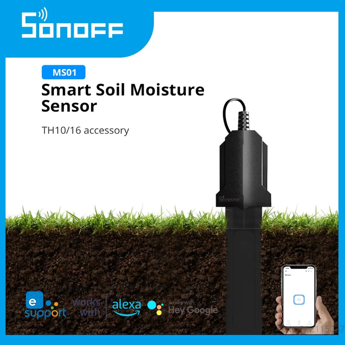 MS01 trabalha com SONOFF TH10/16 para medir com precisão a humidade do solo e enviar dados para o seu telemóvel. MS01 pode regar e verificar regularmente a humidade do solo a qualquer altura e em qualquer lugar para que as suas flores cresçam mais saudáveis. Este é um acessório utilizado em SONOFF TH10 / TH16.