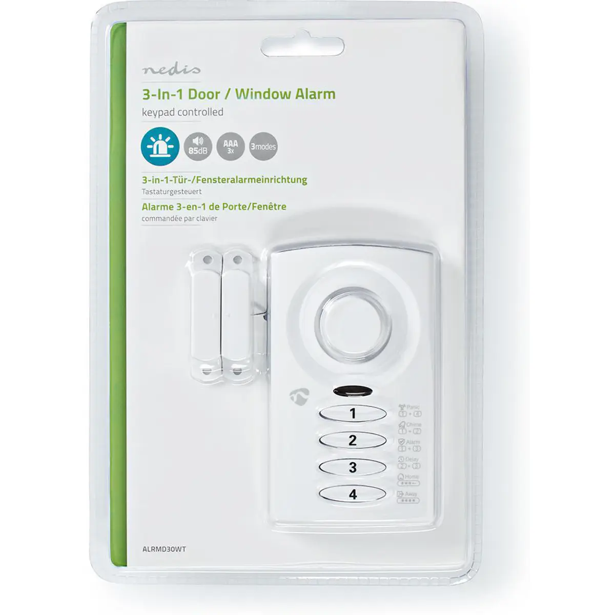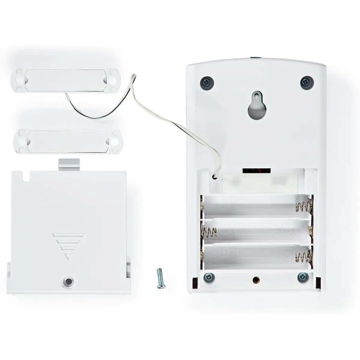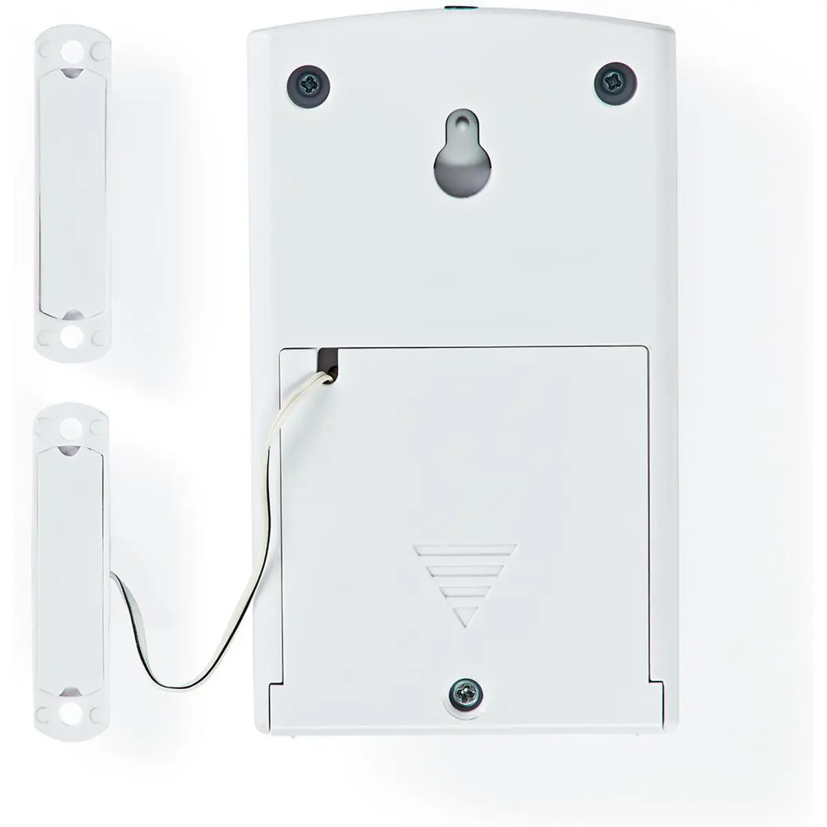 O alarme é alimentado por 3 pilhas alcalinas LR03 (AAA) e inclui um adaptador AC/DC opcional para um conector de adaptador jack mono de 4,5 V DC - 2,5 mm. Assim, pode garantir que ele esteja sempre disponível.