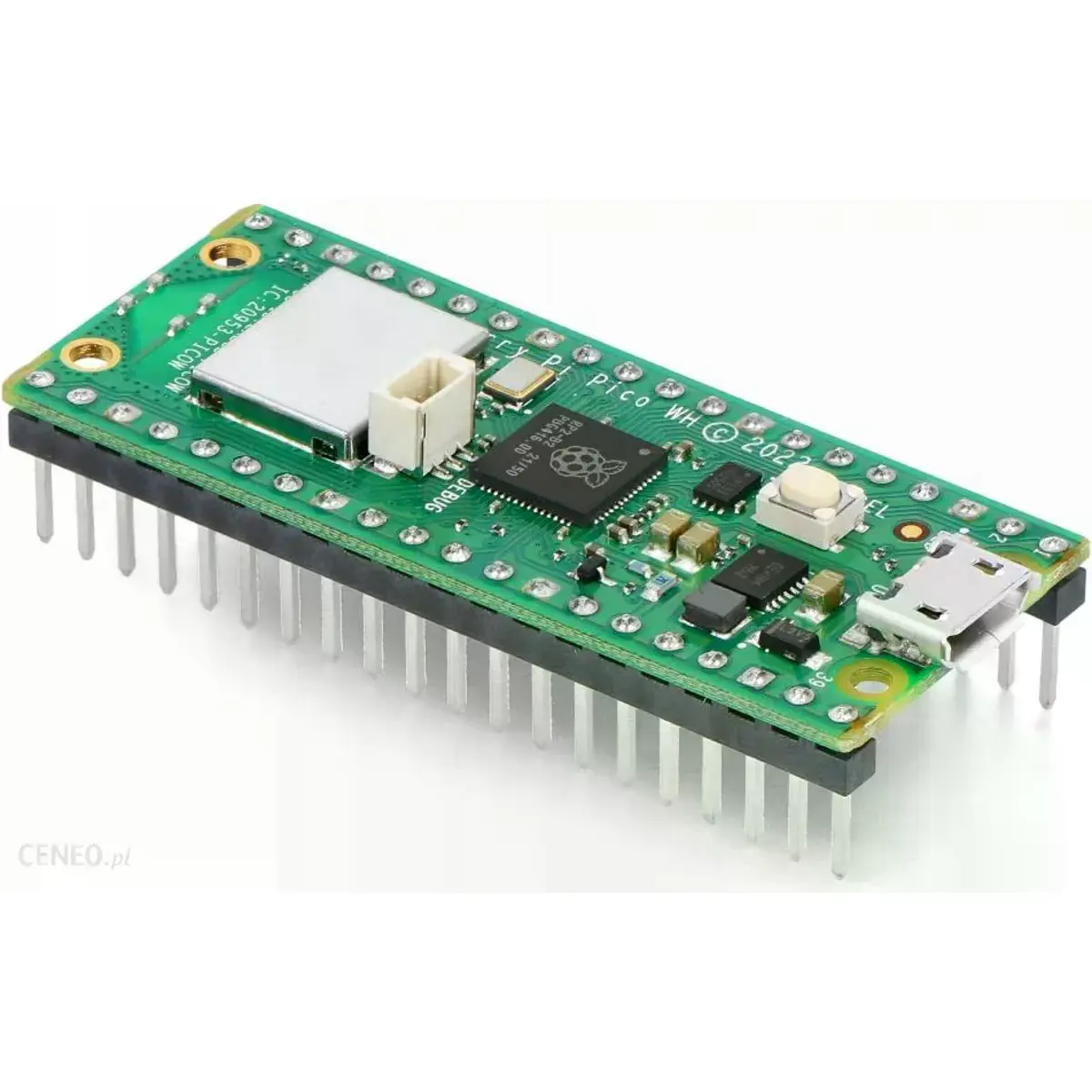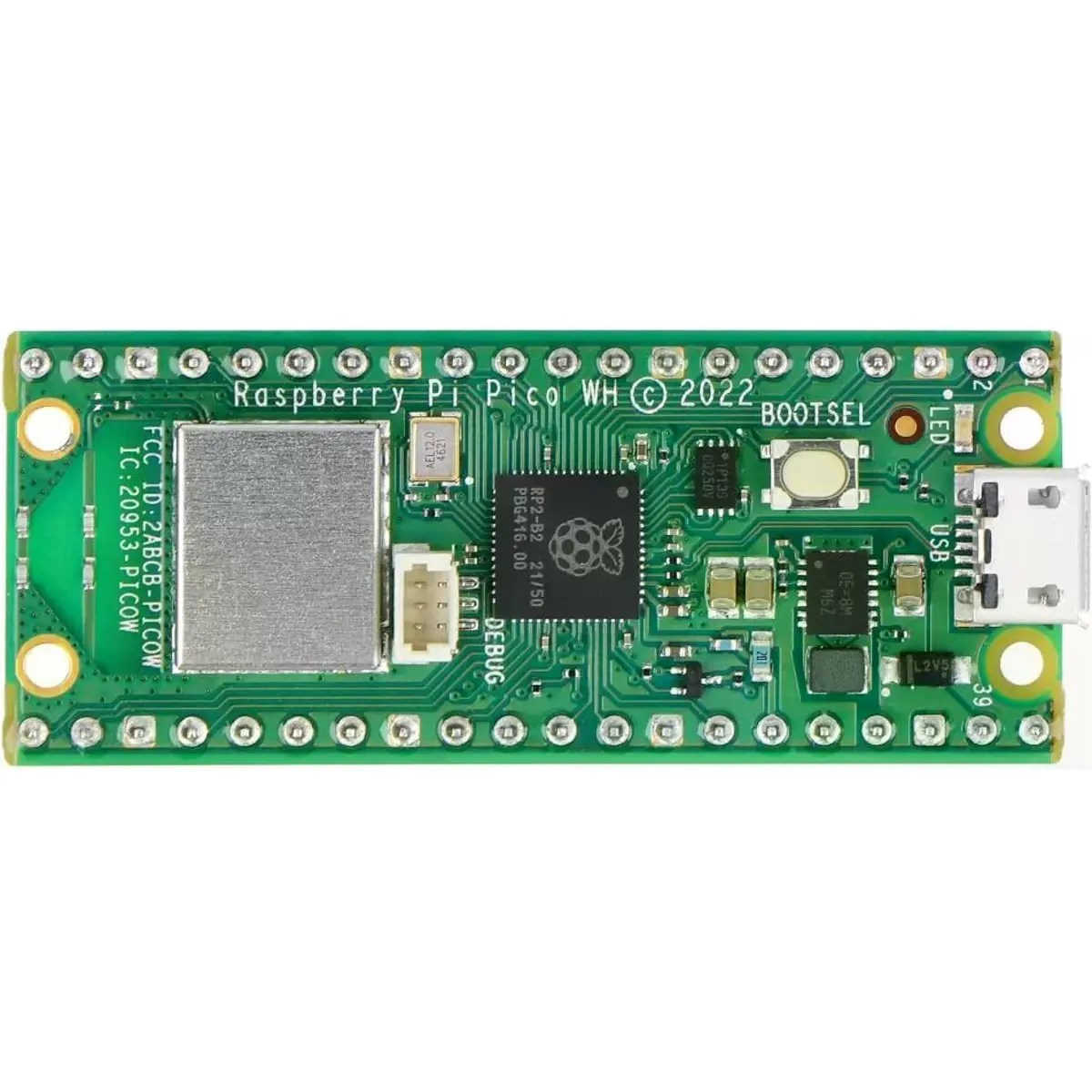 Raspberry Pi Pico WH é uma placa microcontroladora baseada no chip microcontrolador RP2040 da Raspberry Pi e foi concebida para ser uma plataforma de desenvolvimento de baixo custo, mas flexível, disponibilizando uma interface Wireless de 2.4GHz (Wi-Fi 802.11n) e já vem com pinos soldados (Header).