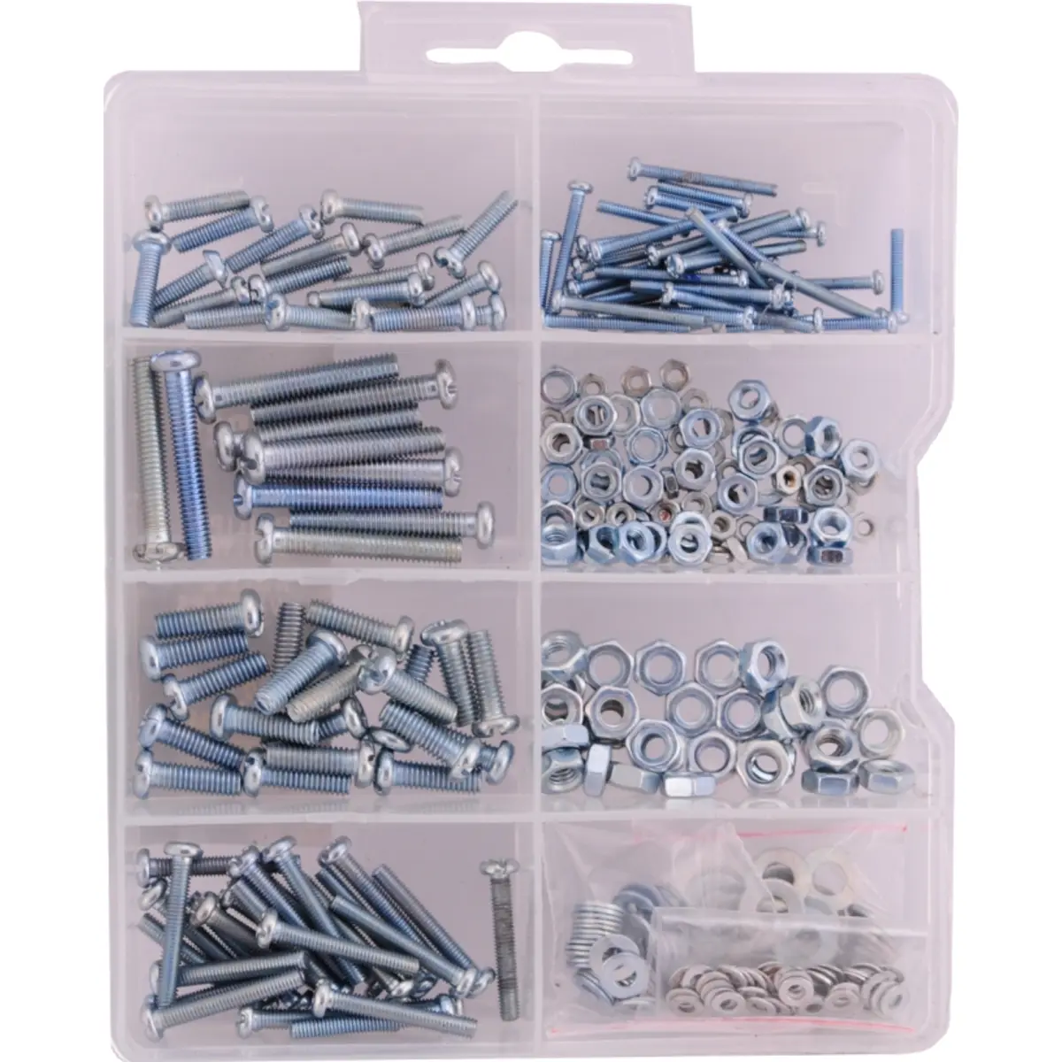 Conjunto completo de fixação composto por parafusos, porcas e anilhas em diferentes tamanhos, ideal para projetos eletrónicos, mecânicos e de montagem geral. Fornecido em quantidades equilibradas para utilização prática e organizada.