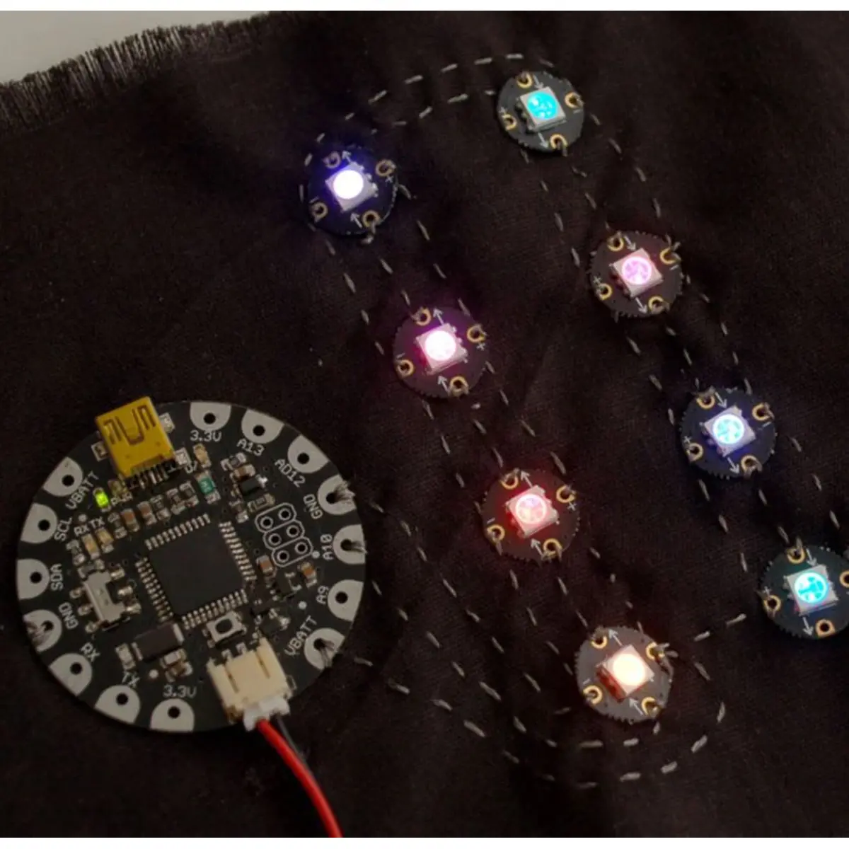 Os pixels são sequenciais - então só precisa de 1 fio para controlar os LEDs que quiser em série. Estes são fáceis de costurar e o design em cruz significa que não há linhas cruzadas.