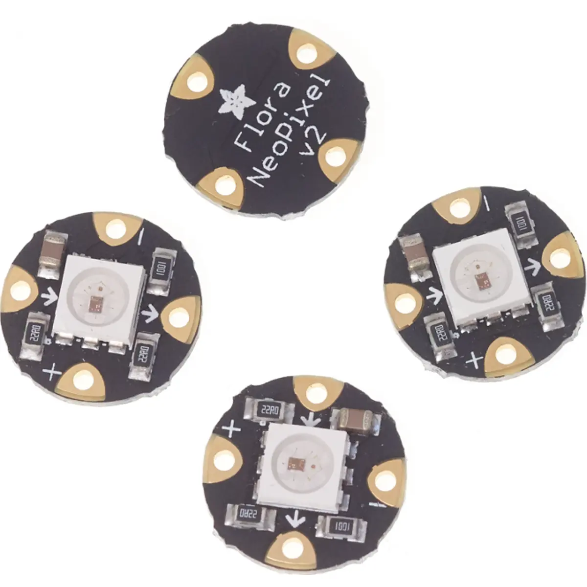 Esta é a segunda versão do Flora NeoPixels, que funciona em comunicação de 800KHz de 'alta velocidade'. Infelizmente, não são compatíveis com o Flora NeoPixels de 'baixa velocidade' (400KHz) chip-on-back. Se você tem um projeto que já usa pixels de baixa velocidade e deseja anexar mais pixels à série, precisará adquirir a versão 1, pois não são compatíveis entre si.