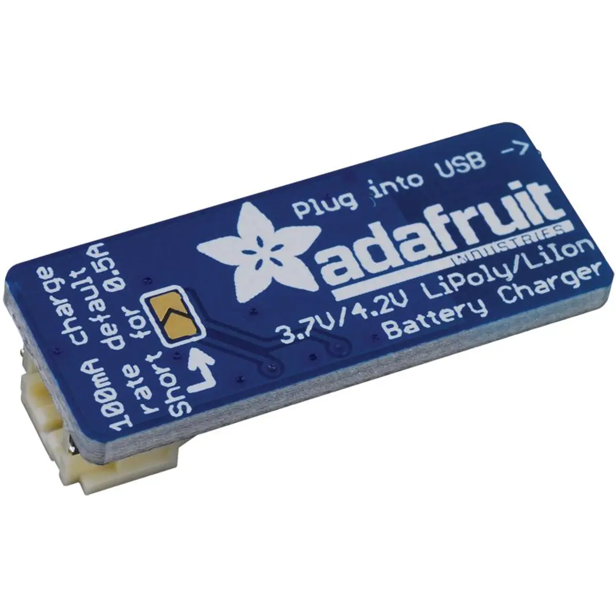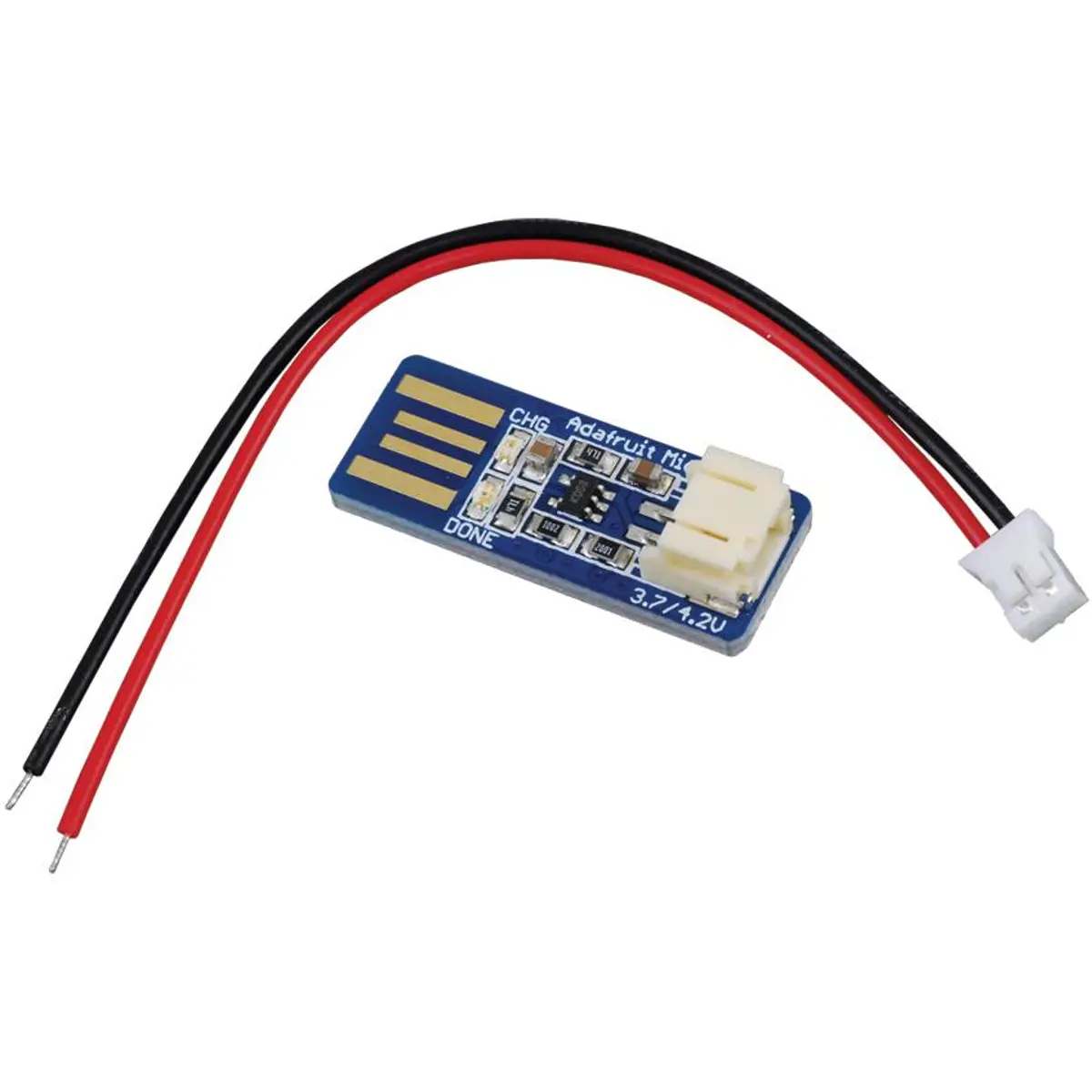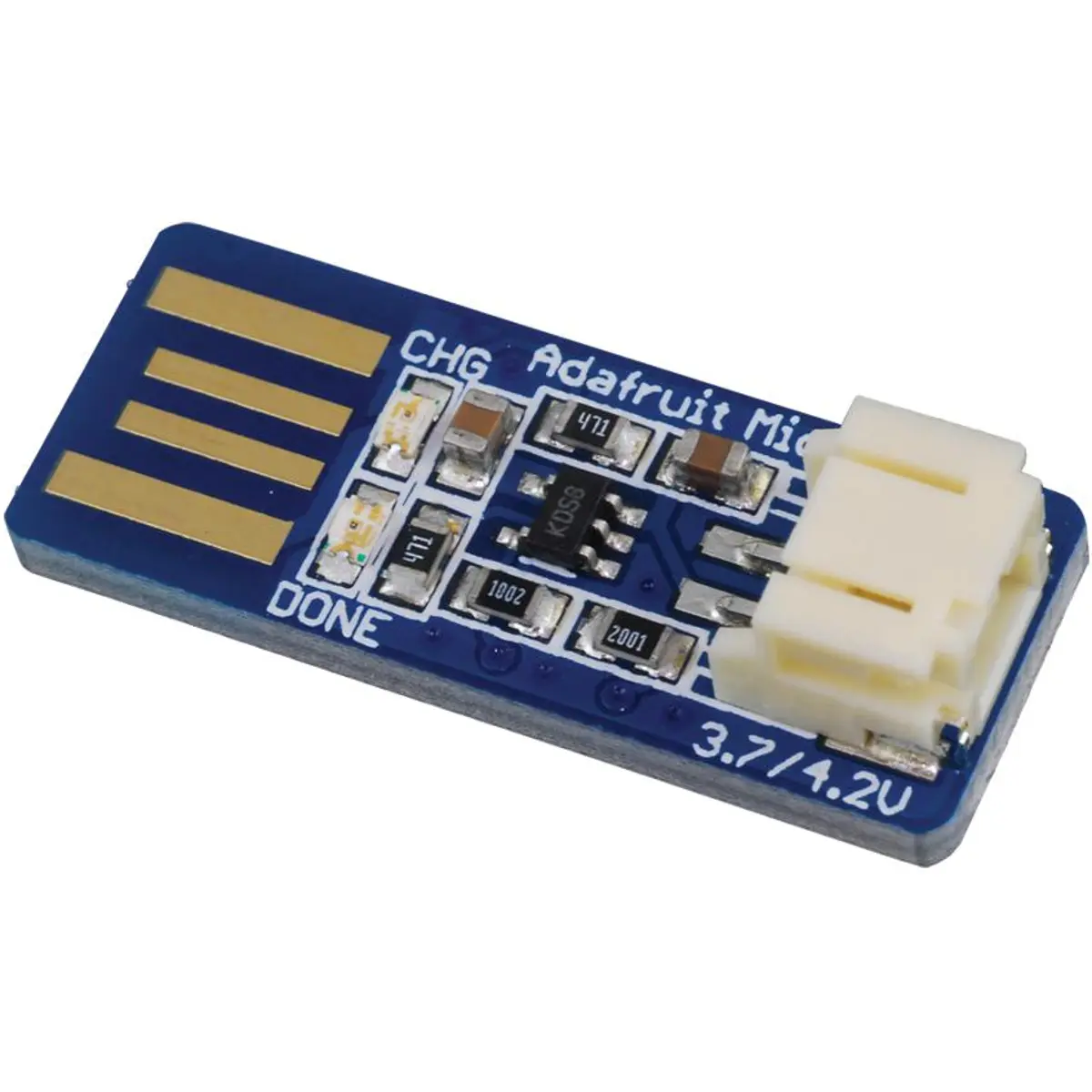 Basta conectar os contatos banhados a ouro em qualquer porta USB e uma bateria recarregável de polímero de lítio ou iões de lítio de 3.7V / 4.2V na ficha JST na outra extremidade. Existem dois LEDs - um vermelho e um verde. Durante o carregamento, o LED vermelho acende. Quando a bateria estiver totalmente carregada e pronta para uso, o LED verde acende.