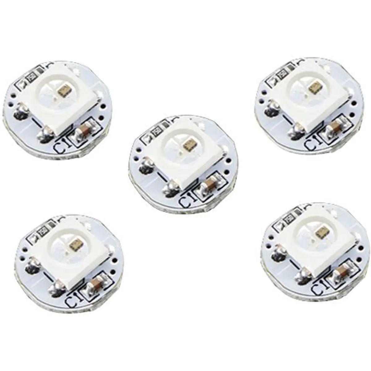 Conjunto de 5 módulos LED RGB endereçáveis (WS2812B/SK6812) com driver de corrente constante e 24 bits de cor via PWM. Os LEDs são encadeáveis e podem ser controlados por um único pino de dados, em série, a 800 kHz. Alimentação de 5 VDC (pode funcionar a 3,5 V com desvanecimento). Consumo: até 18,5 mA por LED (~55 mA por pixel), até 60 mA por pixel em branco. Em Arduino, é possível chegar a cerca de 500 pixels a 30 FPS. Dimensões Ø10x8 mm, peso 0,3 g por pixel.